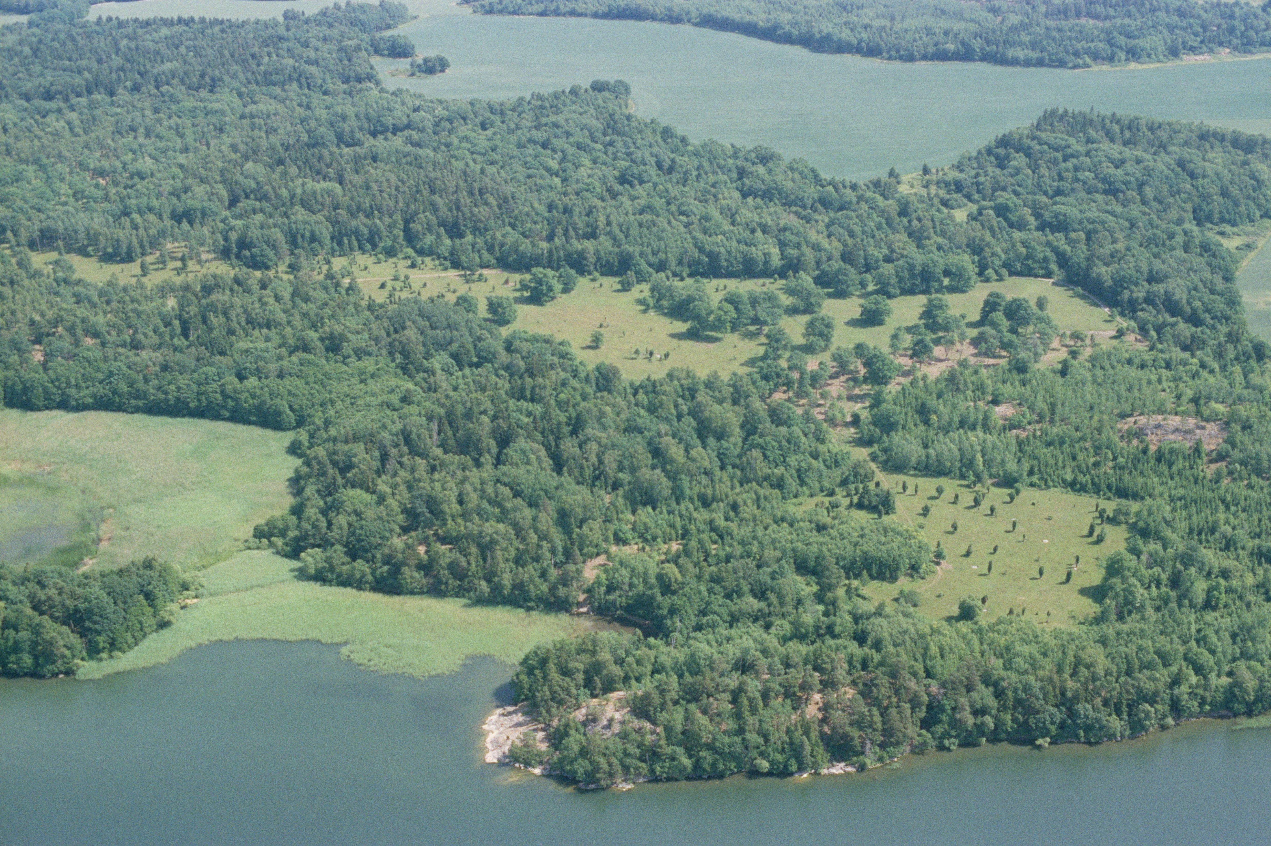Beskrivning: Munsön vid Svinsundet i Mälaren. I bildens nedre del naturreservatet Väsby hage. Vid bildens mitt fossil åker RAÄnr Munsö 30:1. Bilden är tagen mot (väderstreck): Ö