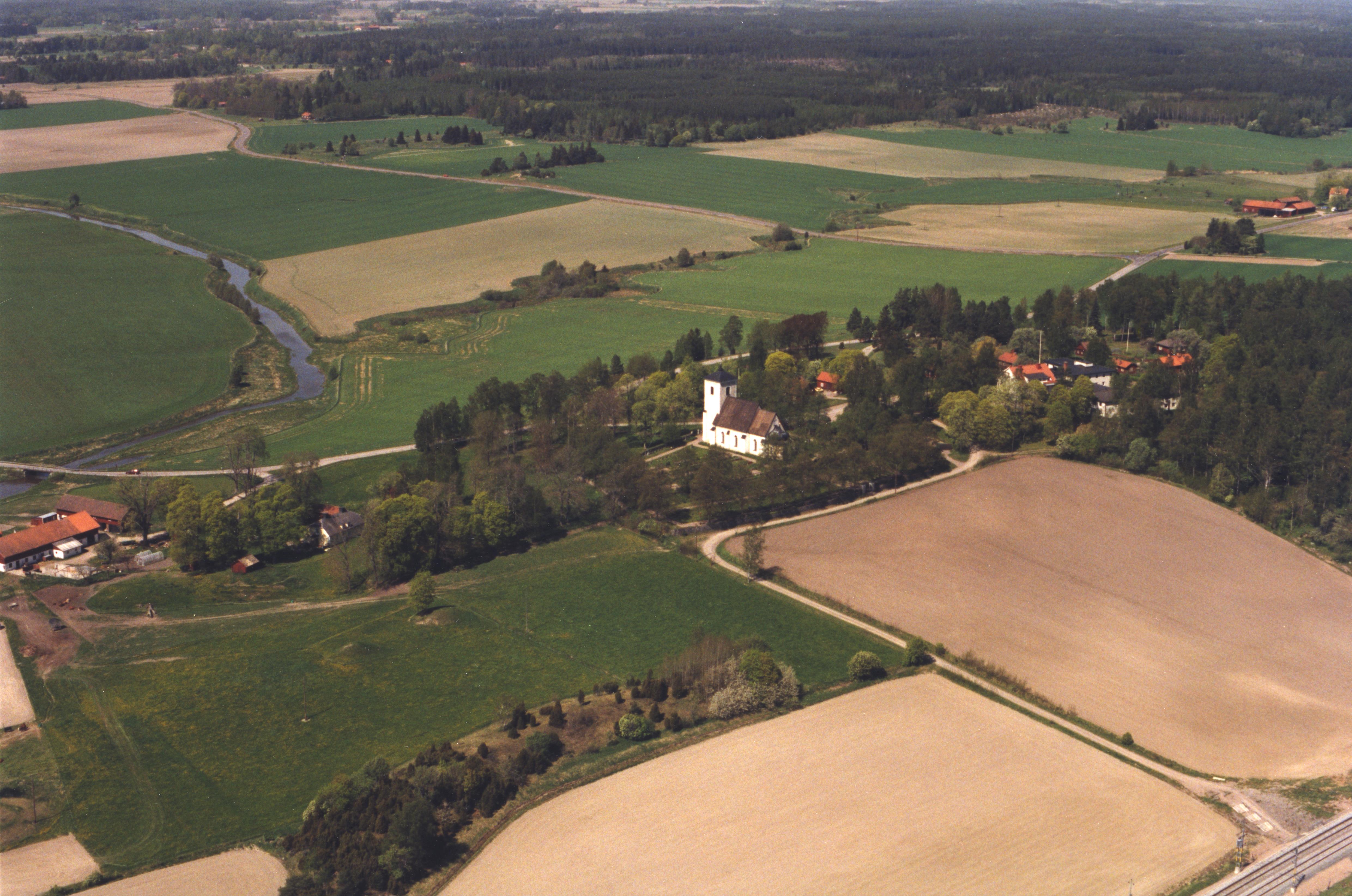 Beskrivning: Lena kyrka och kyrkby. Fyrisån till vänster. Bilden är tagen mot (väderstreck): N