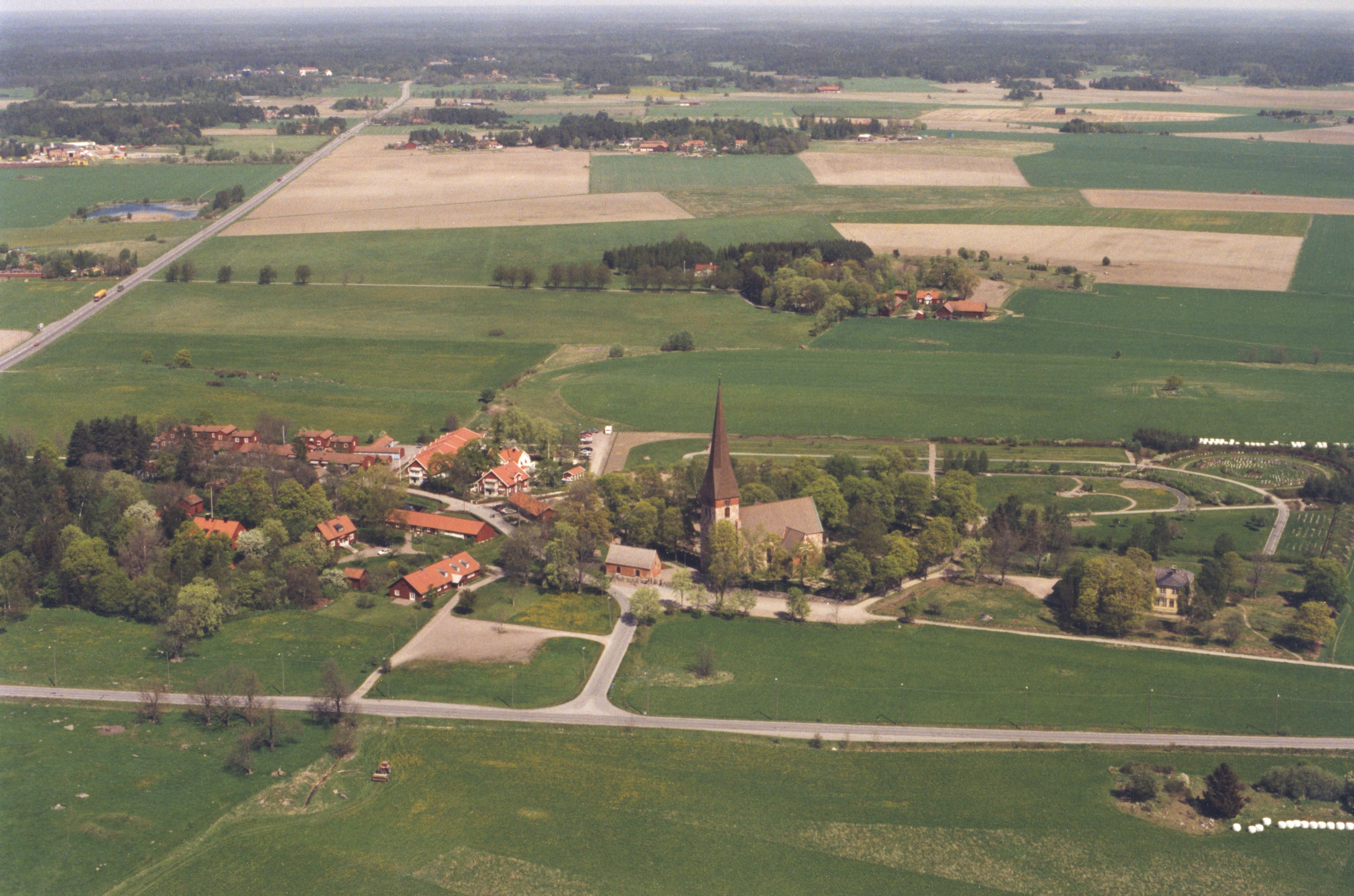 Beskrivning: Vaksala kyrka och kyrkby. Över bildens mitt Vaskesta by. I bildens övre del byarna Eke och Skäve m.fl. Bilden är tagen mot (väderstreck): NO