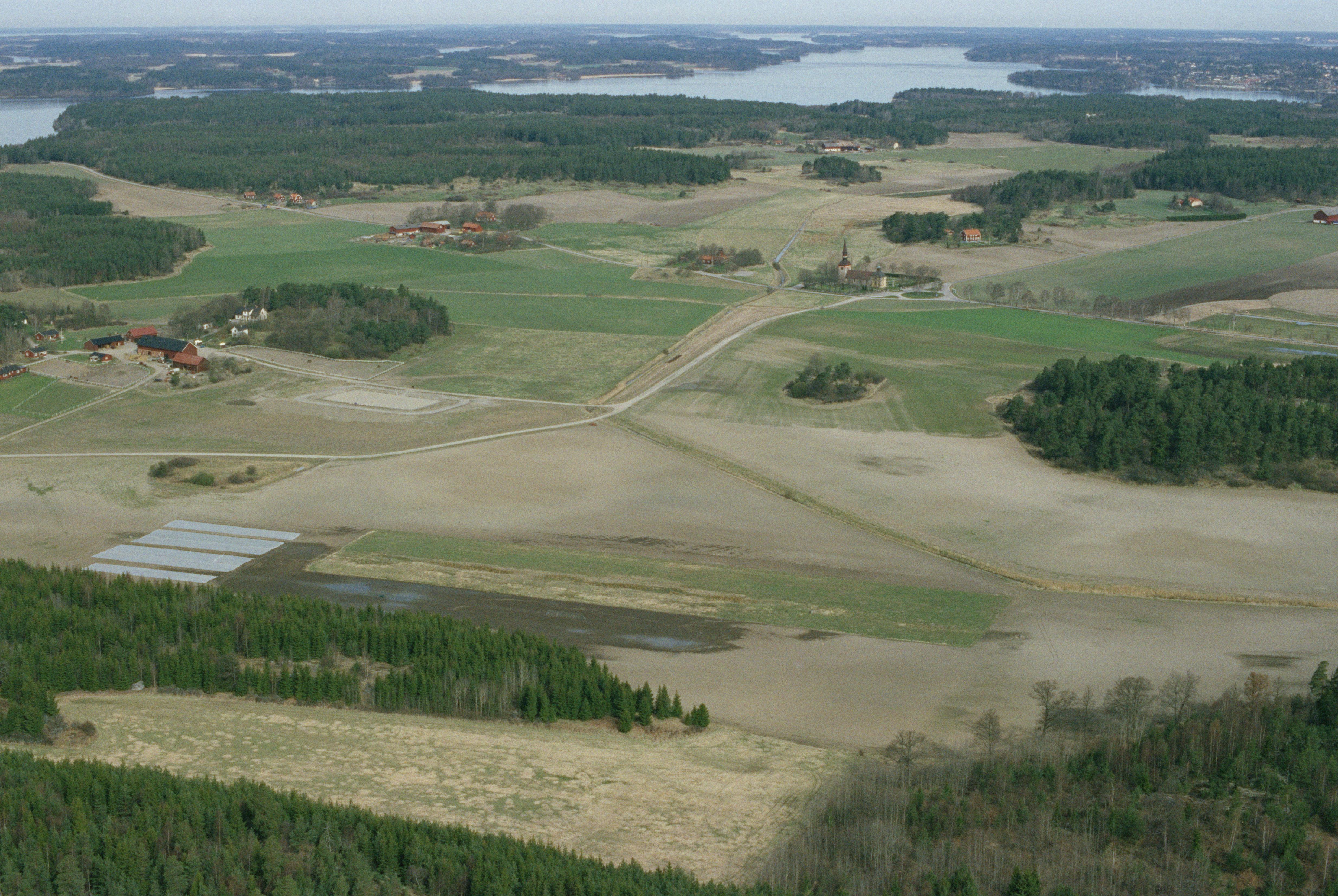 Beskrivning: Lovön. Gravfält RAÄnr Lovö 34:1 och 35:1 m.fl. till höger vid bildens mitt. I bildens övre del Lovö kyrka och prästgård. Bilden är tagen mot (väderstreck): NV