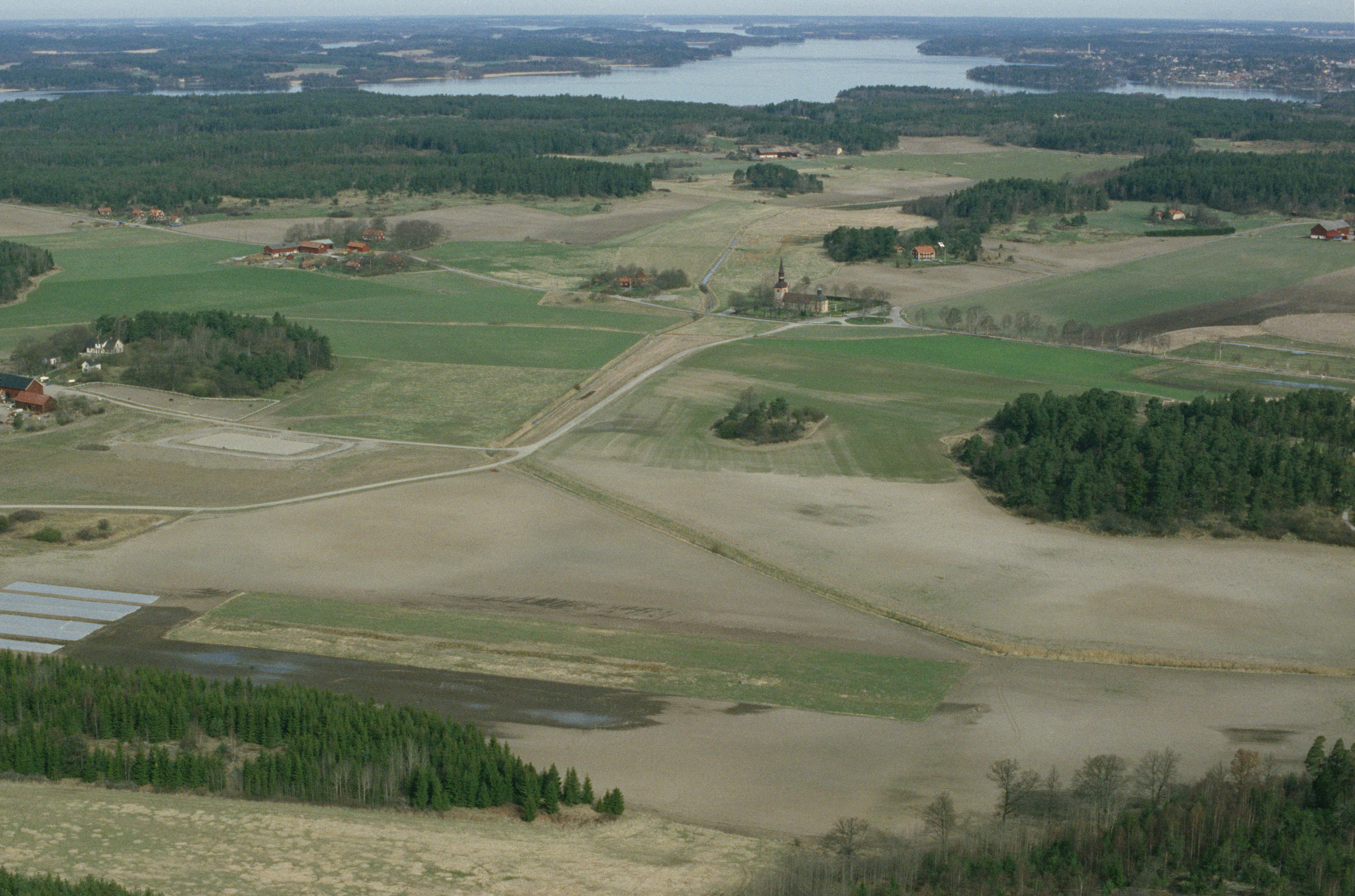Beskrivning: Lovön. Gravfält RAÄnr Lovö 34:1 och 35:1 m.fl. till höger vid bildens mitt. I bildens övre del Lovö kyrka och prästgård. Bilden är tagen mot (väderstreck): NV