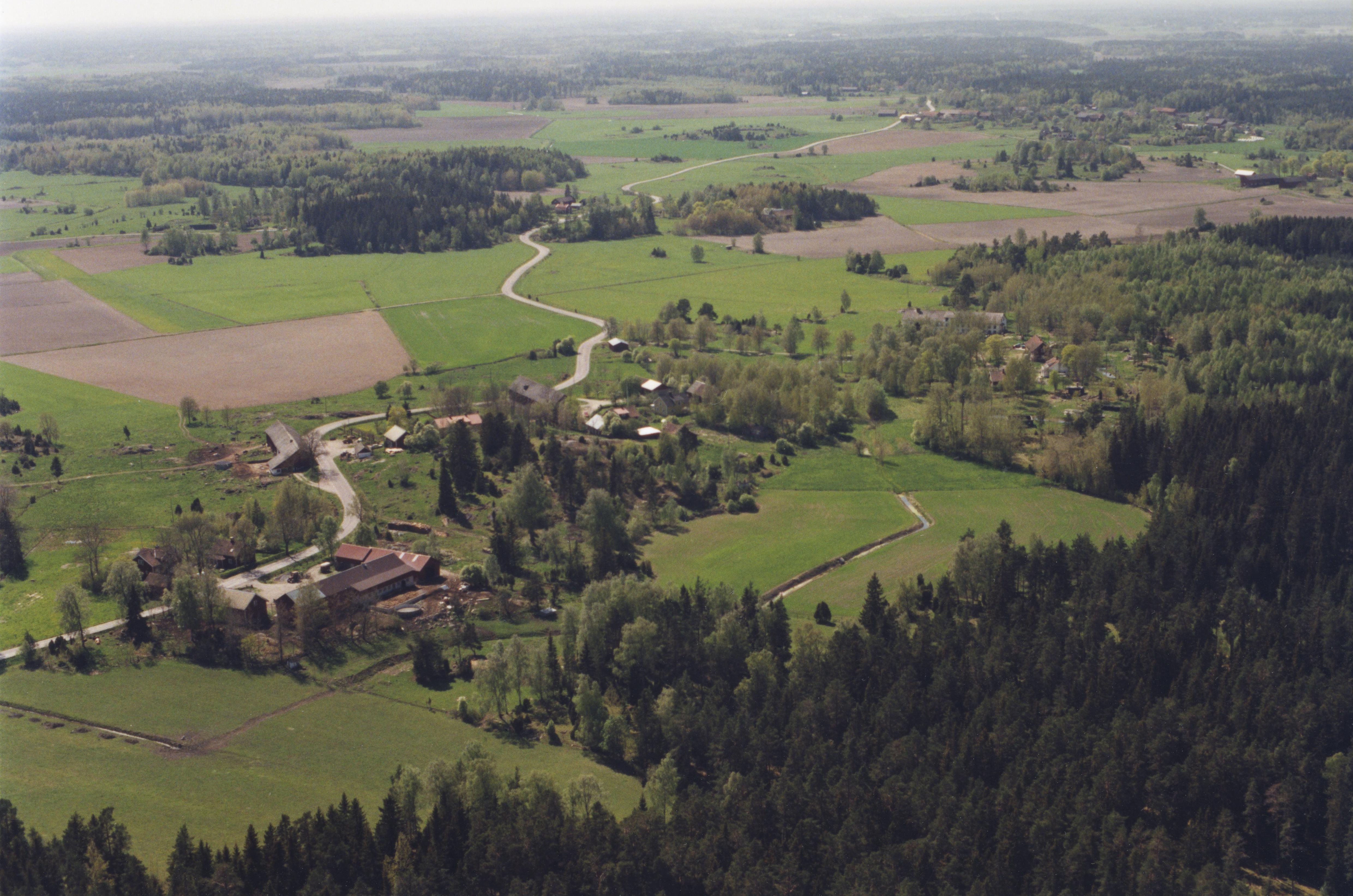 Beskrivning: Hånsta by och gravfält RAÄnr Ekeby 100:1 vid bildens mitt. Över bildens mitt gränsen mot Alunda socken. Bilden är tagen mot (väderstreck): VSV