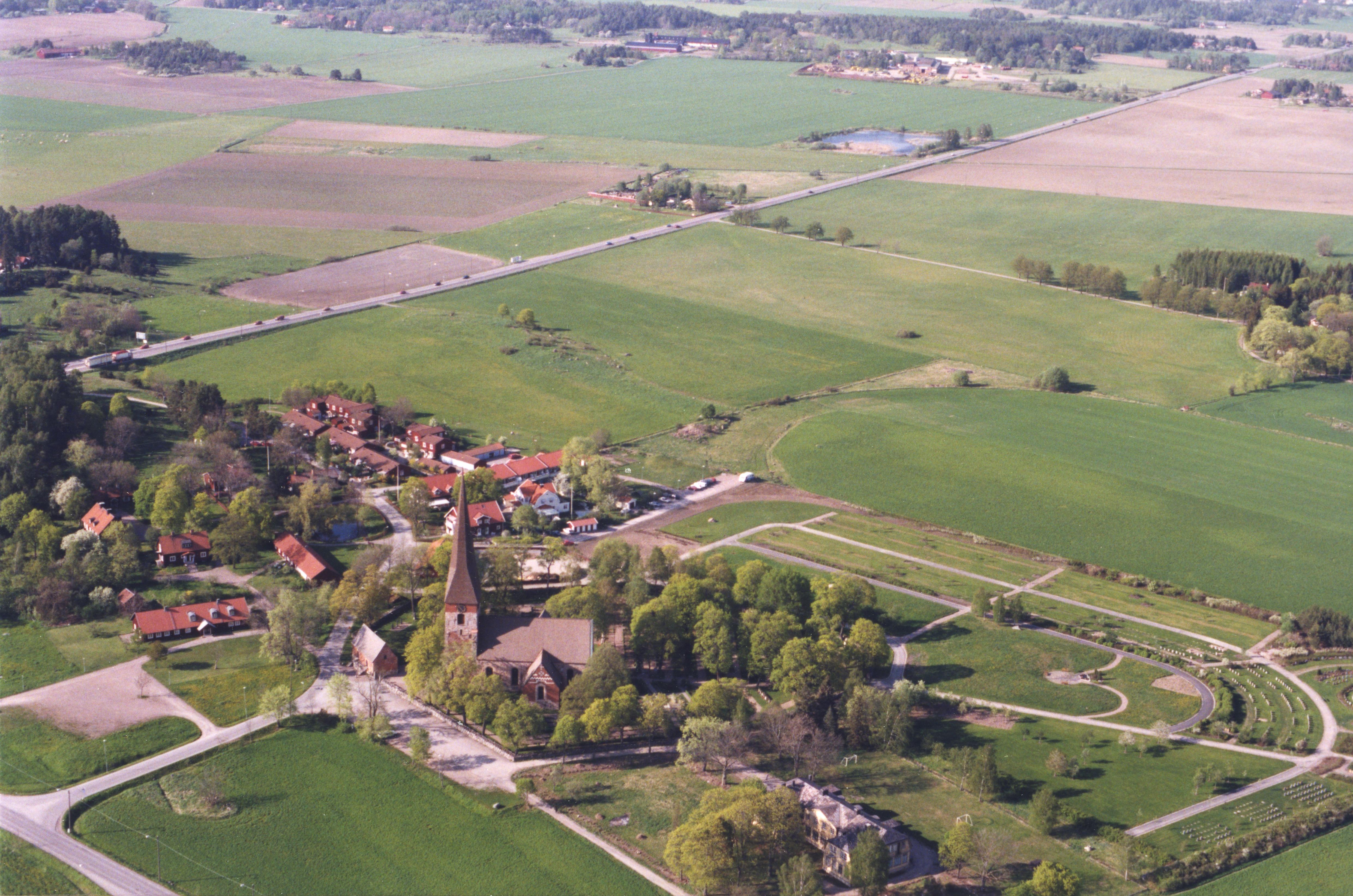 Beskrivning: Vaksala kyrka och kyrkby. Till höger om bildens mitt Vaskesta by. I bildens övre del byarna Eke och Skäve m.fl. Bilden är tagen mot (väderstreck): N