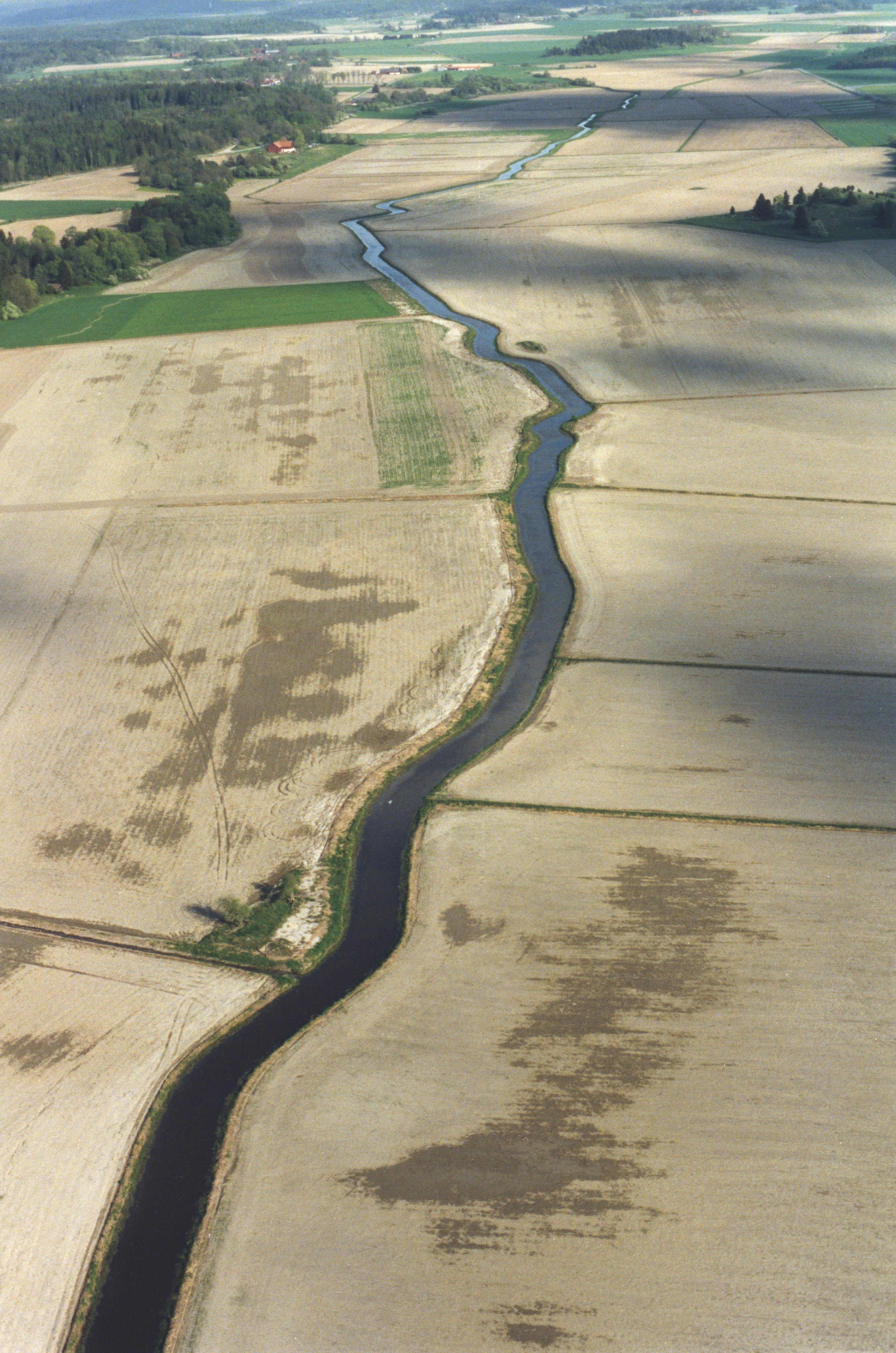 Beskrivning: Storån i Långhundraleden. I bildens nedre del området söder om Årby och Marma. Över bildens mitt gränsen mot Östuna socken. Hammartorp (röd byggnad) och fornlämning Urberget RAÄnr Östuna 21:1 till vänster i bildens övre del. Bilden är tagen mot (väderstreck): SO