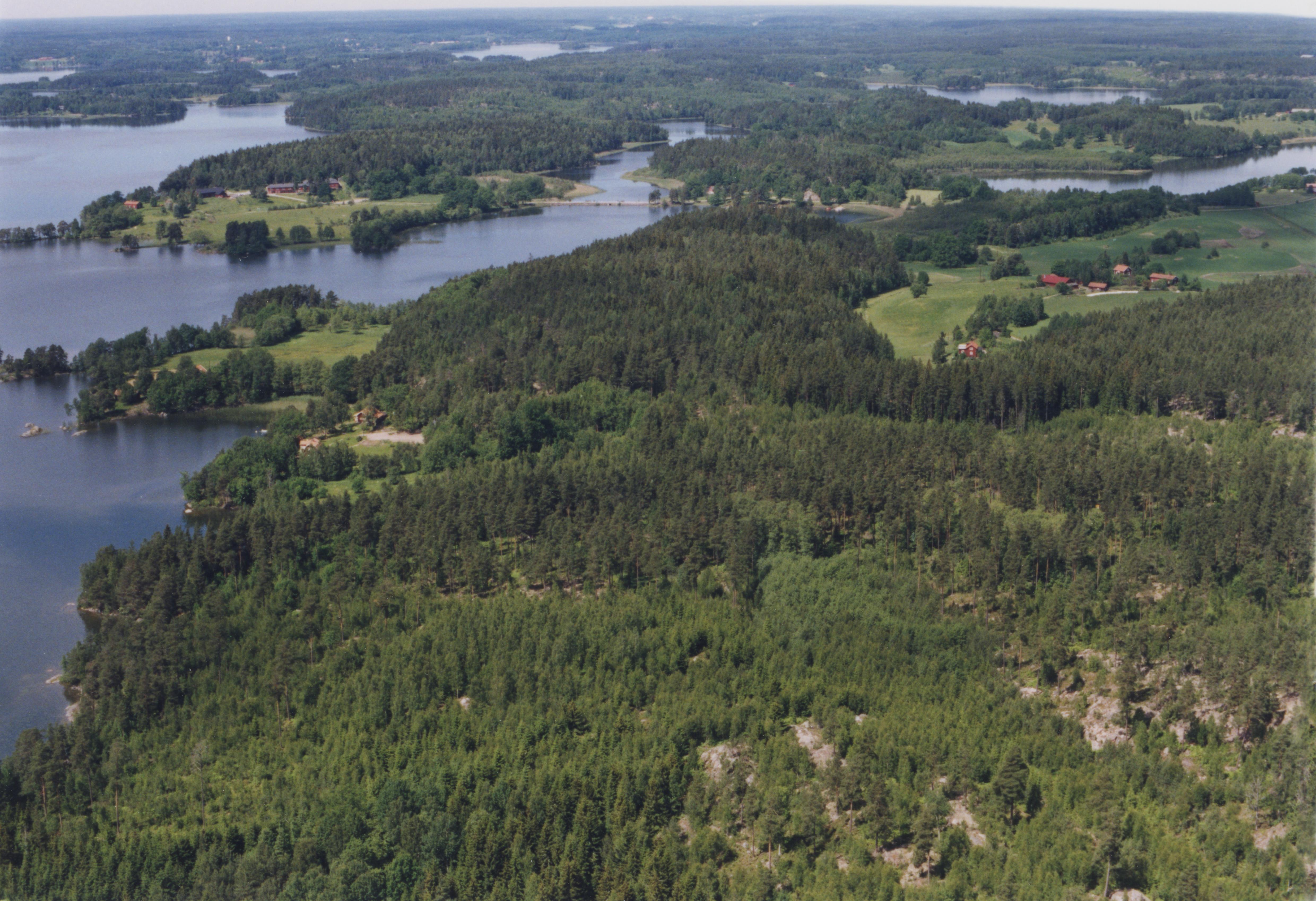 Beskrivning: Hyltingeö vid sjön Båven. Fornborg RAÄnr Hyltinge 62:1 vid bildens mitt. Överby Lillgård uppe till höger. I bildens övre del bron till Aspön och Aspö kursgård i Helgesta socken. Bilden är tagen mot (väderstreck): V