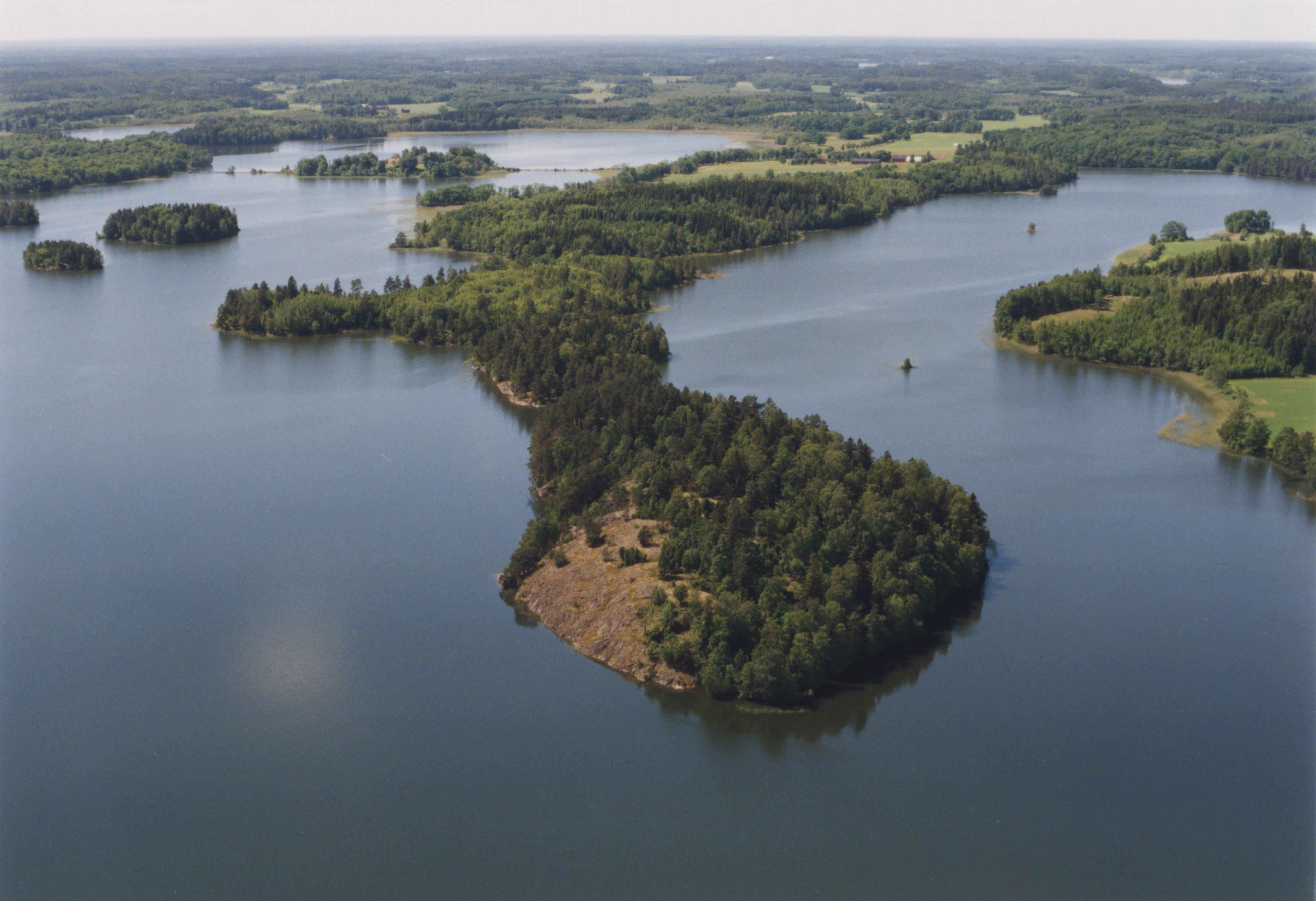 Beskrivning: Djurön i sjön Båven. Fornborg RAÄnr Årdala 124:1 "Fyrstens fornborg". I bildens övre del till vänster Vibyholms slott. Bilden är tagen mot (väderstreck): SV