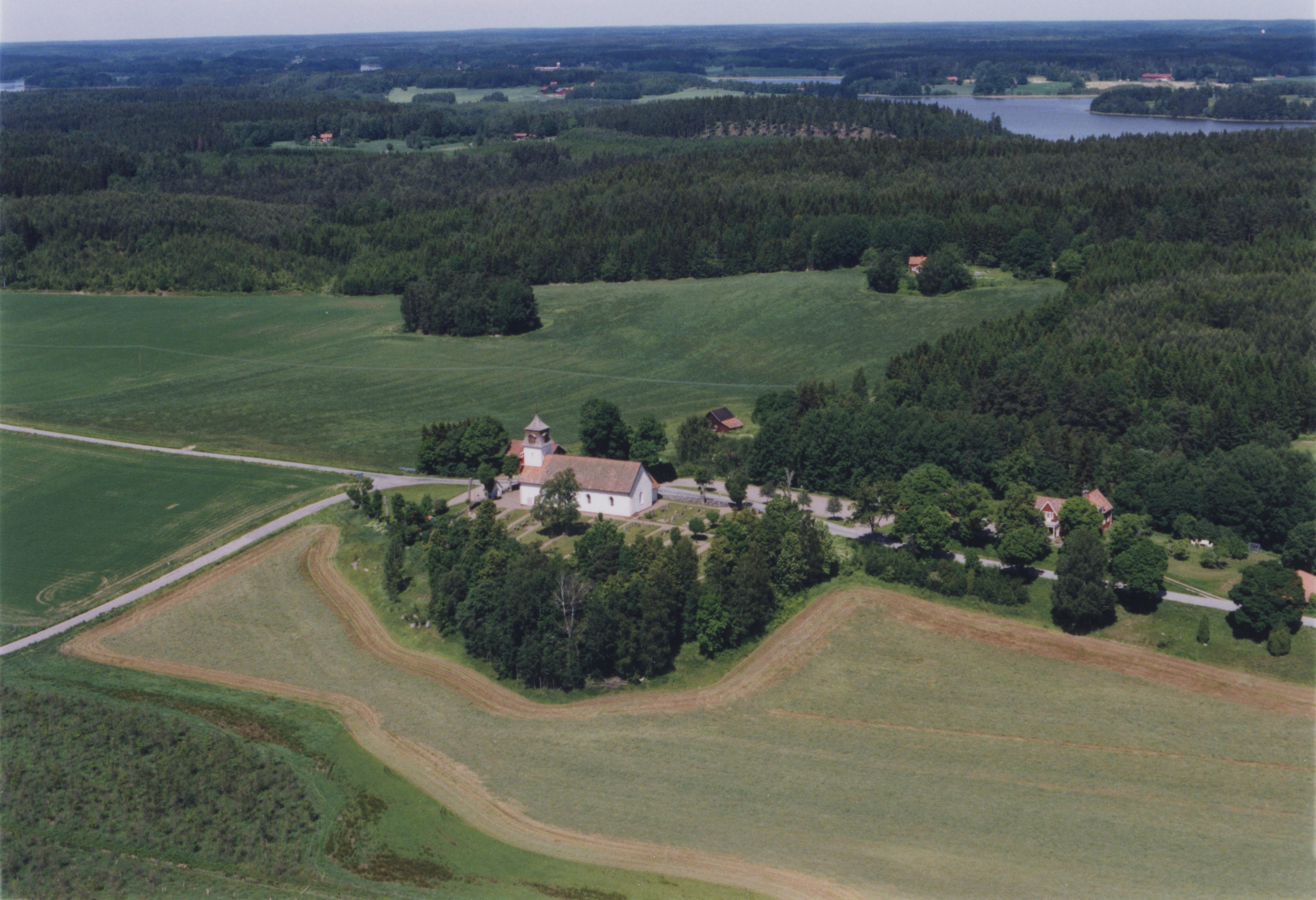 Beskrivning: Årdala kyrka. Sjön Båven i bildens övre del. Bilden är tagen mot (väderstreck): NNV