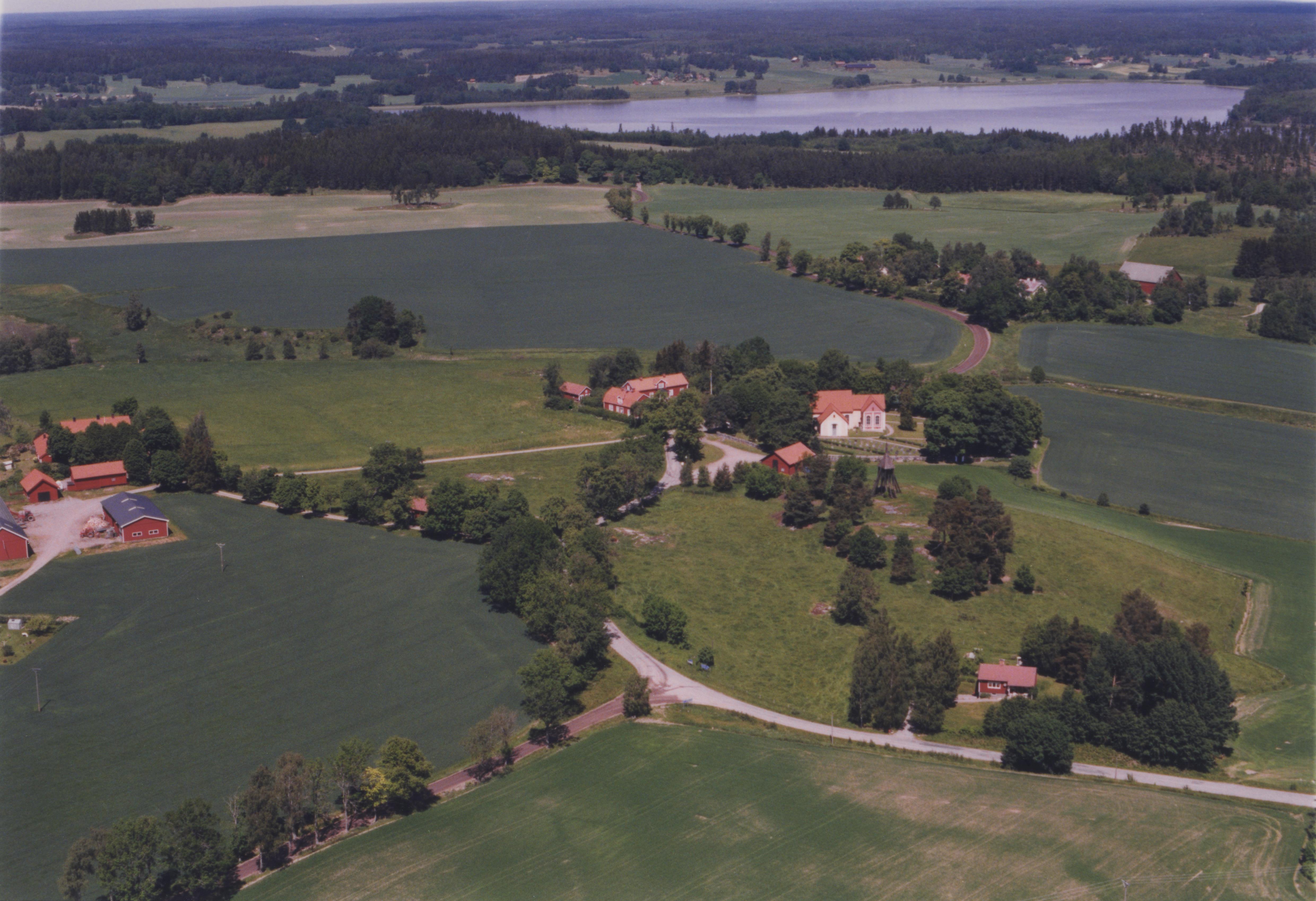 Beskrivning: Runtuna kyrka. Till vänster Tybble gård. I bildens övre del sjön Eknaren. Bilden är tagen mot (väderstreck): N