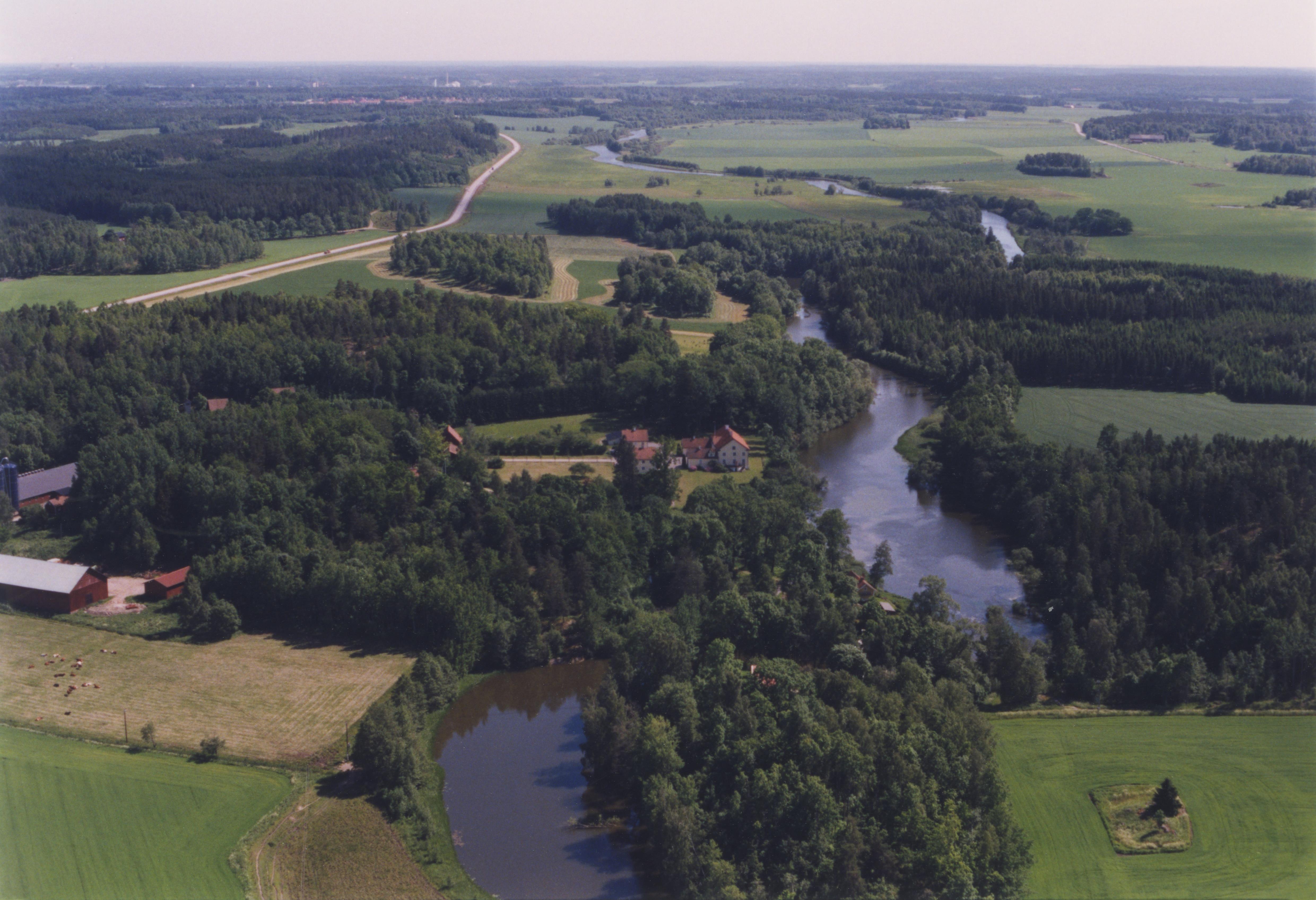 Beskrivning: Nyköpingsån markerar gränsen mellan socknen Helgona (till vänster) och Bärbo (till höger). Till vänster om bildens mitt Kristineholms herrgård (skrivs även Christineholm) i Helgona socken. I bildens nedre del bytomt RAÄnr Helgona 195:1 m.fl. Bilden är tagen mot (väderstreck): SO