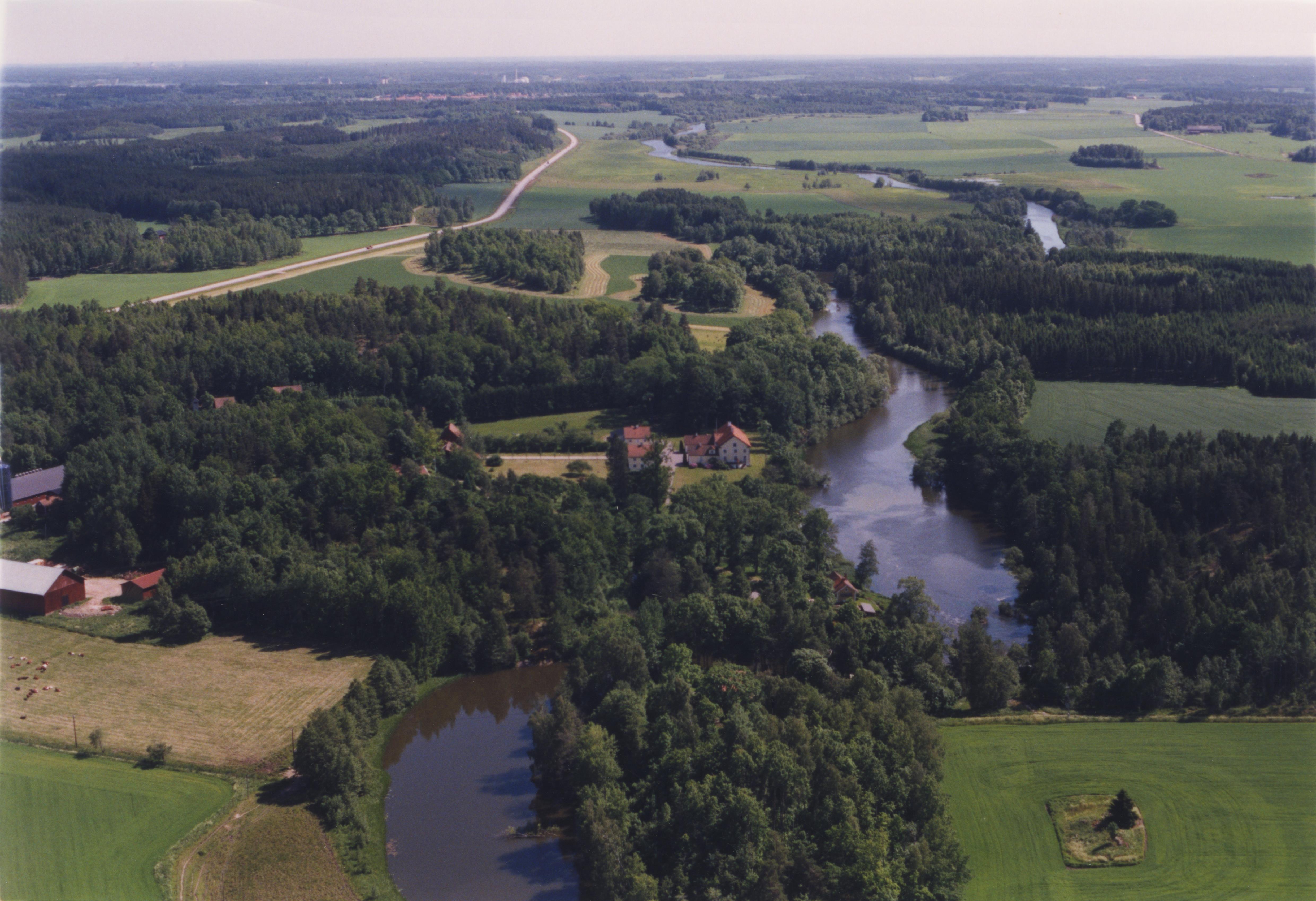 Beskrivning: Nyköpingsån markerar gränsen mellan socknen Helgona (till vänster) och Bärbo (till höger). Till vänster om bildens mitt Kristineholms herrgård (skrivs även Christineholm) i Helgona socken. I bildens nedre del bytomt RAÄnr Helgona 195:1 m.fl. Bilden är tagen mot (väderstreck): SO