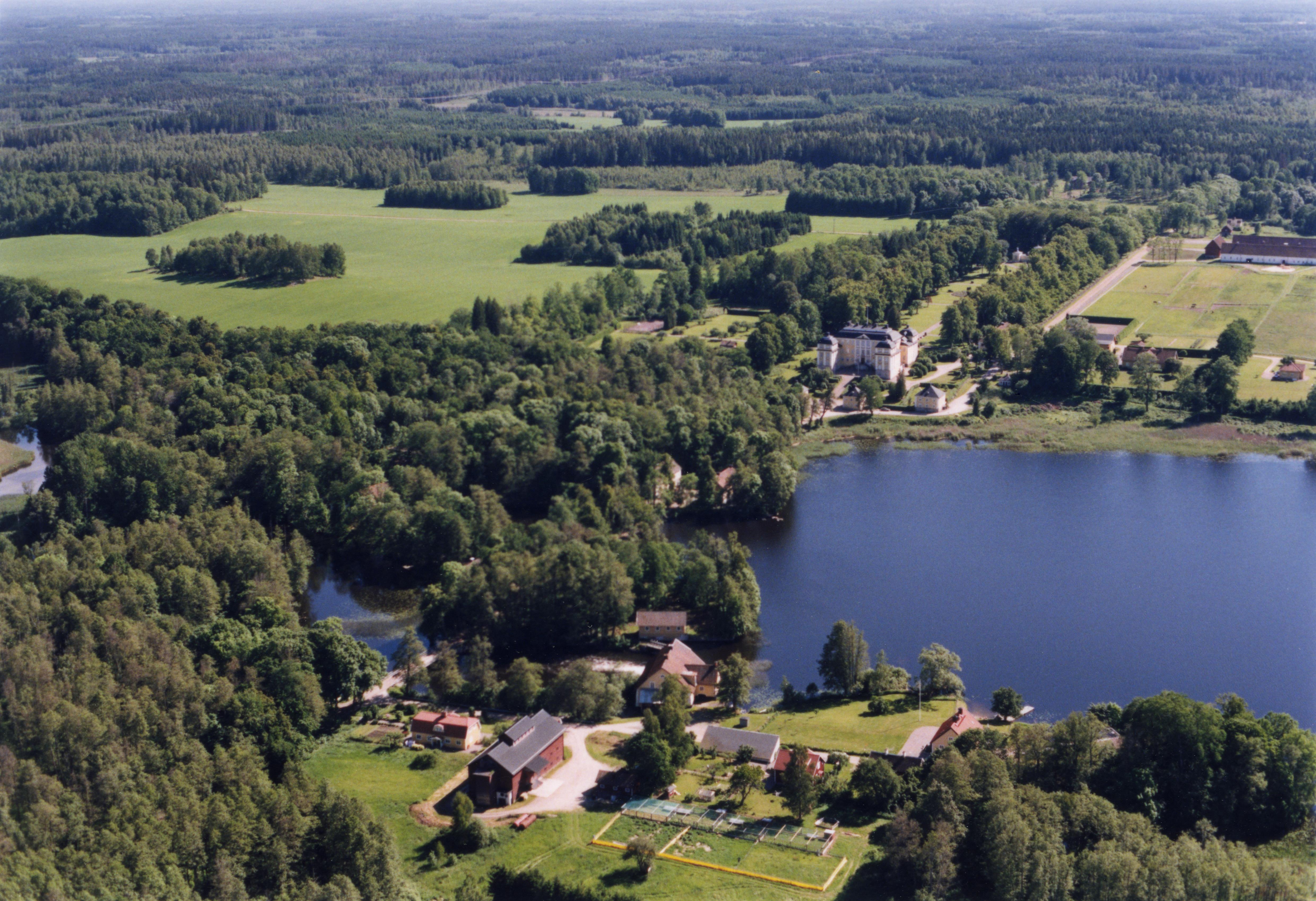 Beskrivning: Eriksbergs slott (skrivs även Ericsbergs slott), byggnadsminne RAÄnr Stora Malm 47:1, mellan Eriksbergssjön och Eriksbergsån. Bilden är tagen mot (väderstreck): S