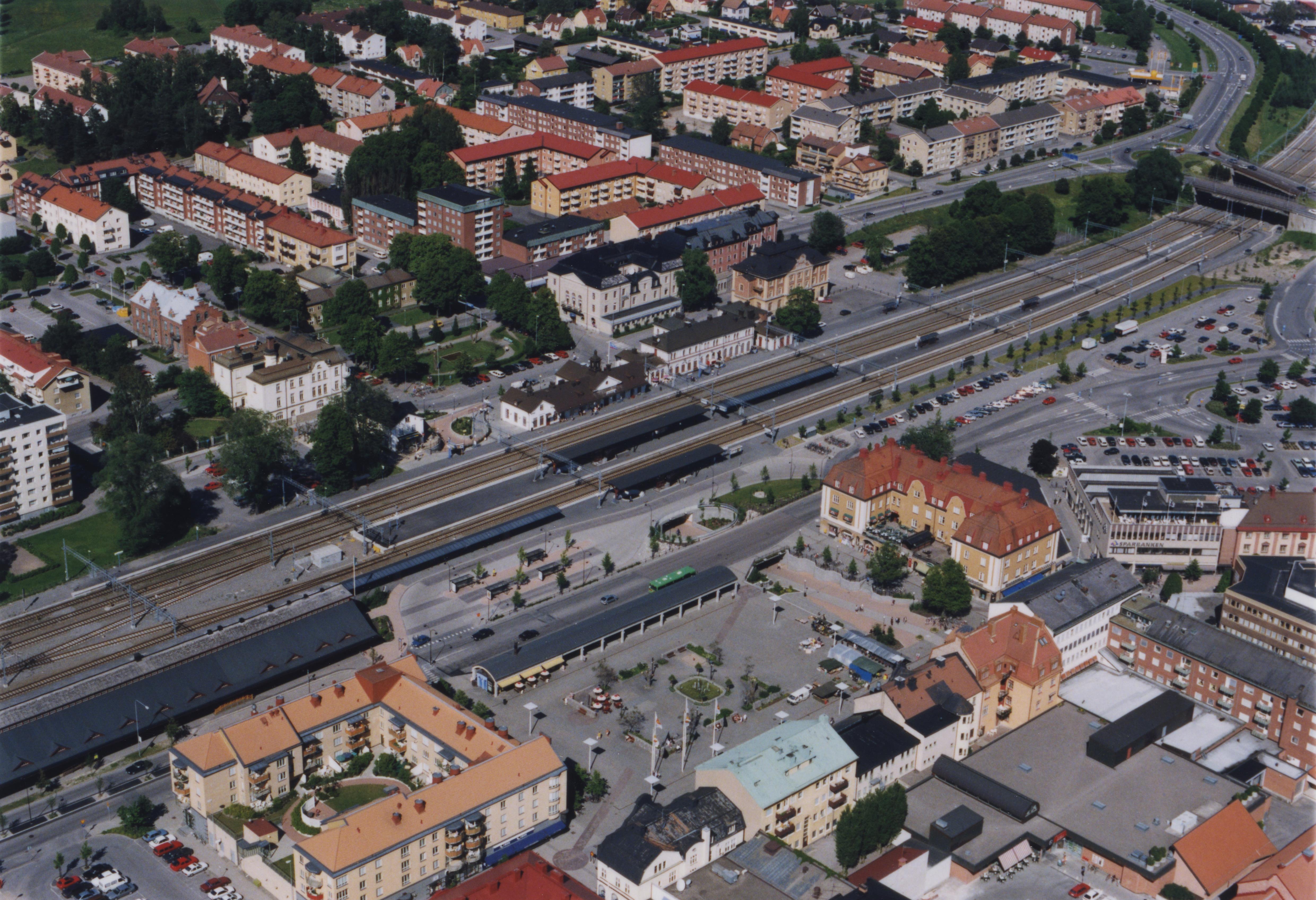 Beskrivning: Katrineholms stad. Järnvägsstationen och Stortorget vid bildens mitt. Bilden är tagen mot (väderstreck): NO