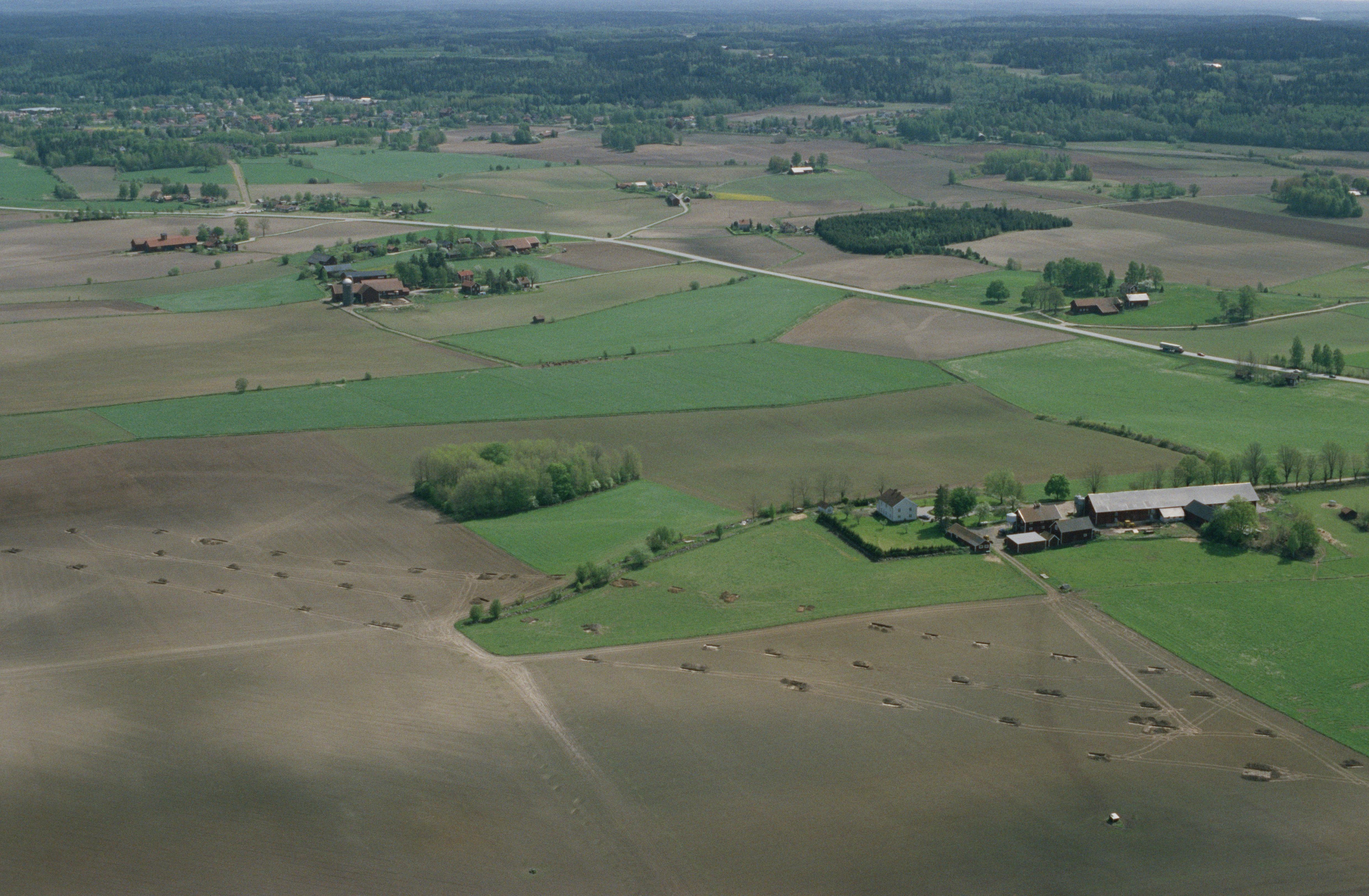 Beskrivning: Vibyslätten sydväst om Vibysjön. Gårdarna Västra Backa, Södra Öna m.fl. Arkeologiska undersökningar innan vägbygge av E3 / E20. Bytomt RAÄnr Viby 348 m.fl. Bilden är tagen mot (väderstreck): OSO