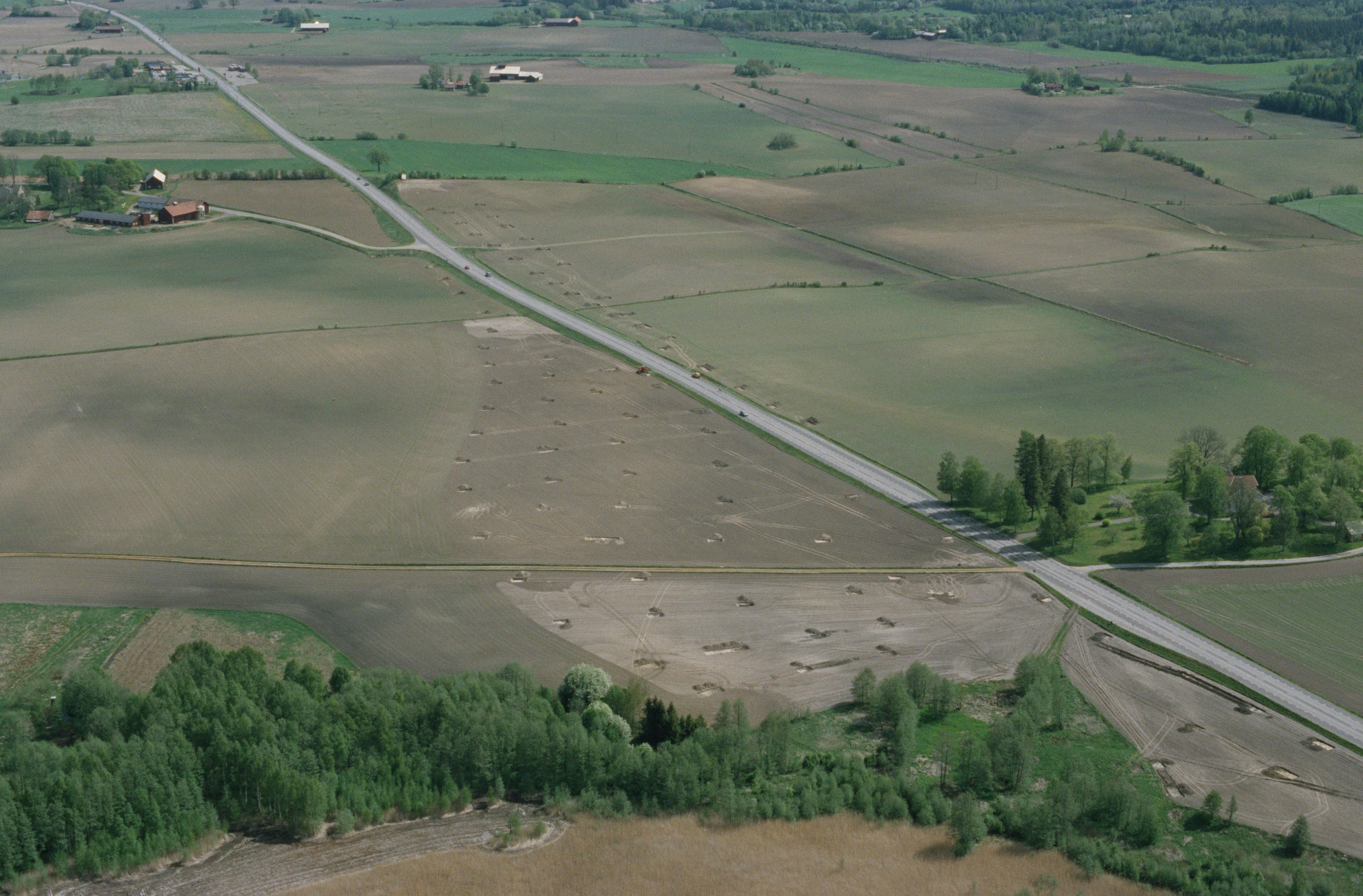 Beskrivning: Arkeologisk undersökning innan vägbygge av E3 / E20 söder om Vibysjön. Bytomt RAÄnr Viby 222:1. Vreten gård uppe till vänster. Bilden är tagen mot (väderstreck): OSO
