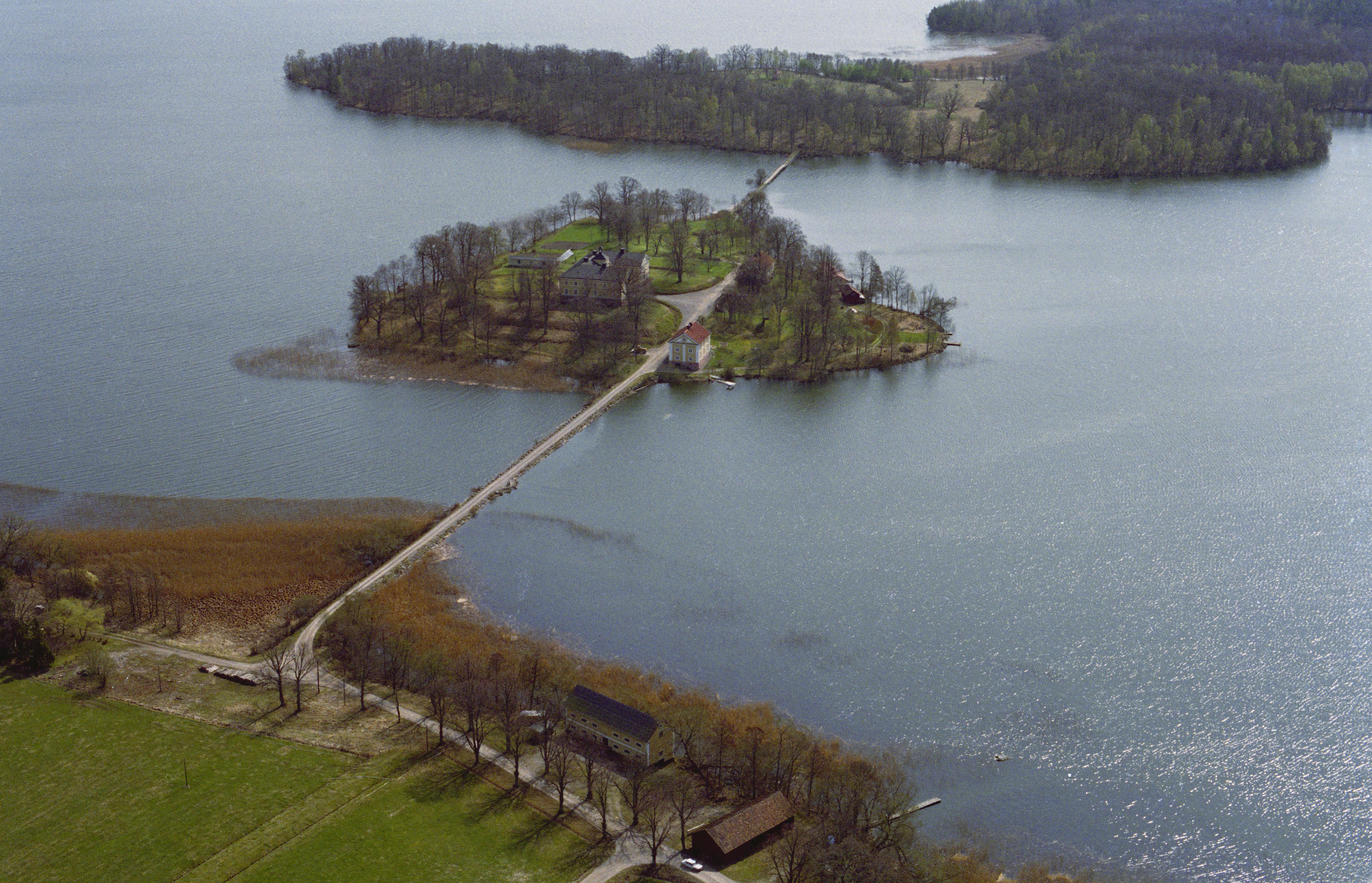 Beskrivning: Vibyholms slott RAÄnr Årdala 123:1 vid sjön Båven. ppe till höger Djurön. Bilden är tagen mot (väderstreck): Ö