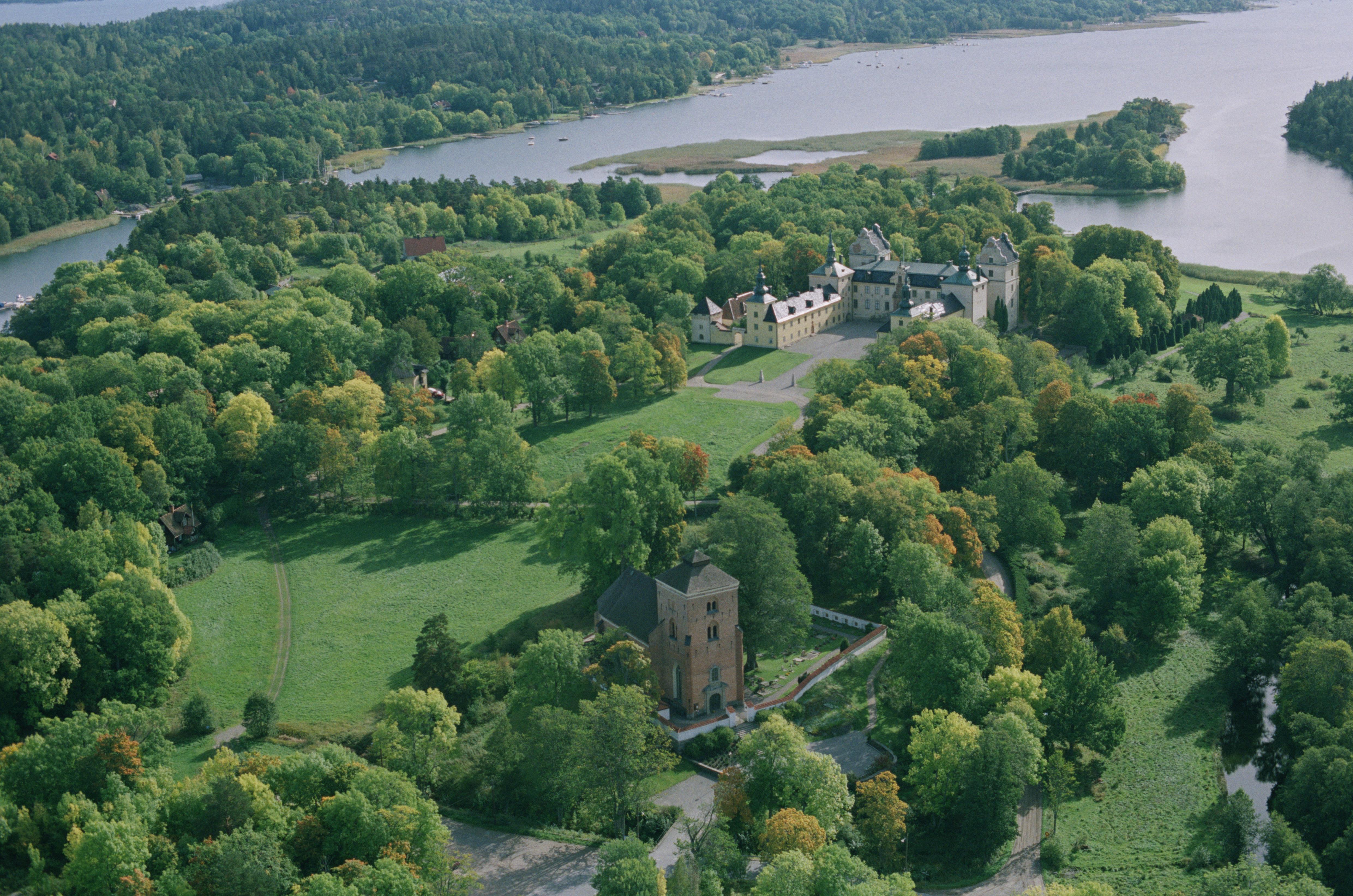 Beskrivning: Tyresö kyrka och Tyresö slott (byggnadsminne RAÄnr Tyresö 37:1) vid Kalvfjärden. Erstaviken uppe i bildens vänstra hörn. Bilden är tagen mot (väderstreck): Ö