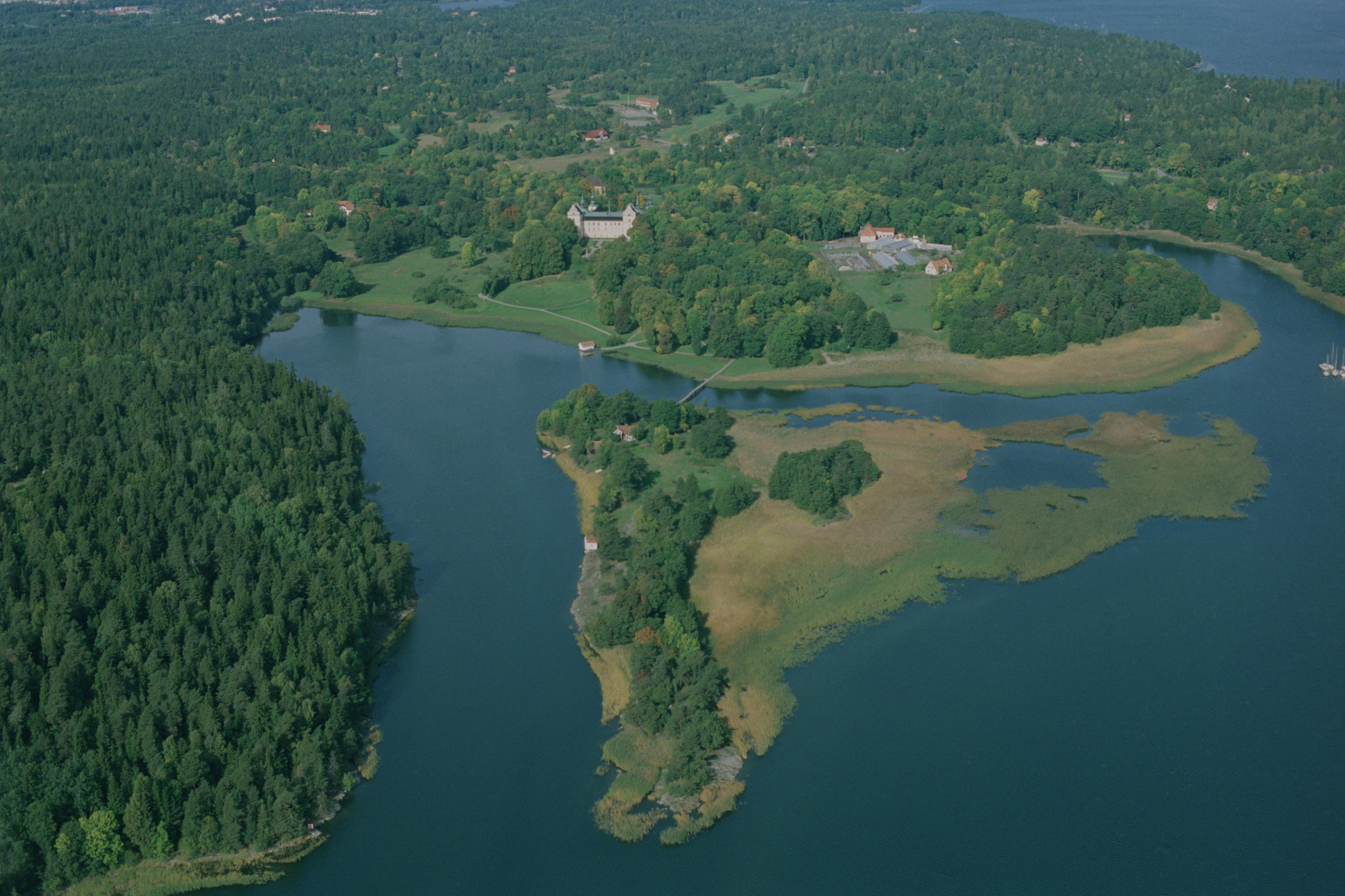 Beskrivning: Tyresö kyrka och Tyresö slott (byggnadsminne RAÄnr Tyresö 37:1) vid Kalvfjärden. Erstaviken uppe till höger. Bilden är tagen mot (väderstreck): NV