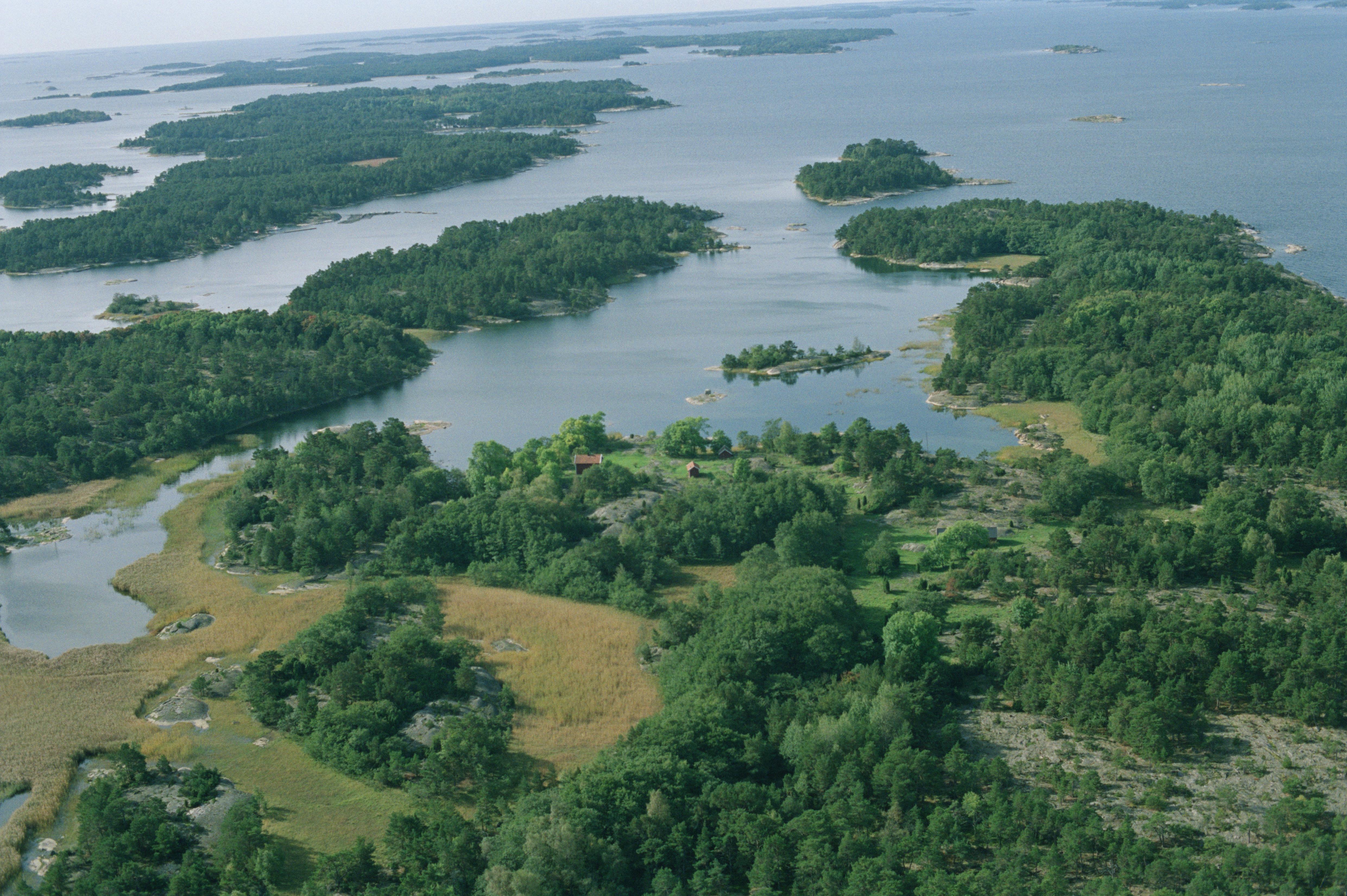 Beskrivning: Jungfruskärs naturreservat i Nämndöfjärden. Ön Jungfruskär med kringliggande öar och holmar. Vid bildens mitt viken Södra fladen och båtlämningen RAÄnr Nämdö 32 vid udden Kuggmaren uppe till vänster. Bilden är tagen mot (väderstreck): S