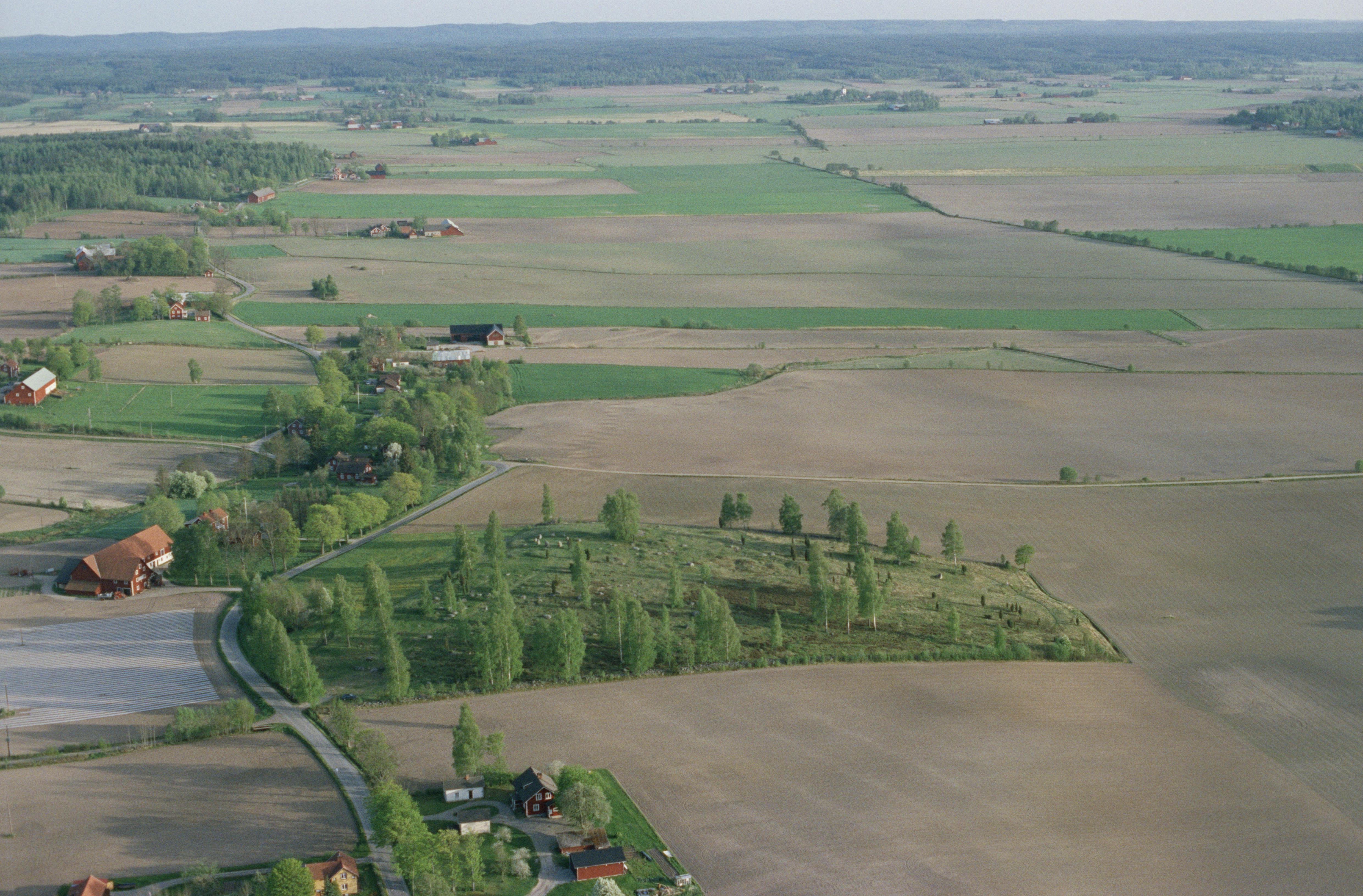 Beskrivning: Hjortsberga by. Under bildens mitt fossil åker och gravfält Lekebacken RAÄnr Kumla 35:1-2. Bilden är tagen mot (väderstreck): S