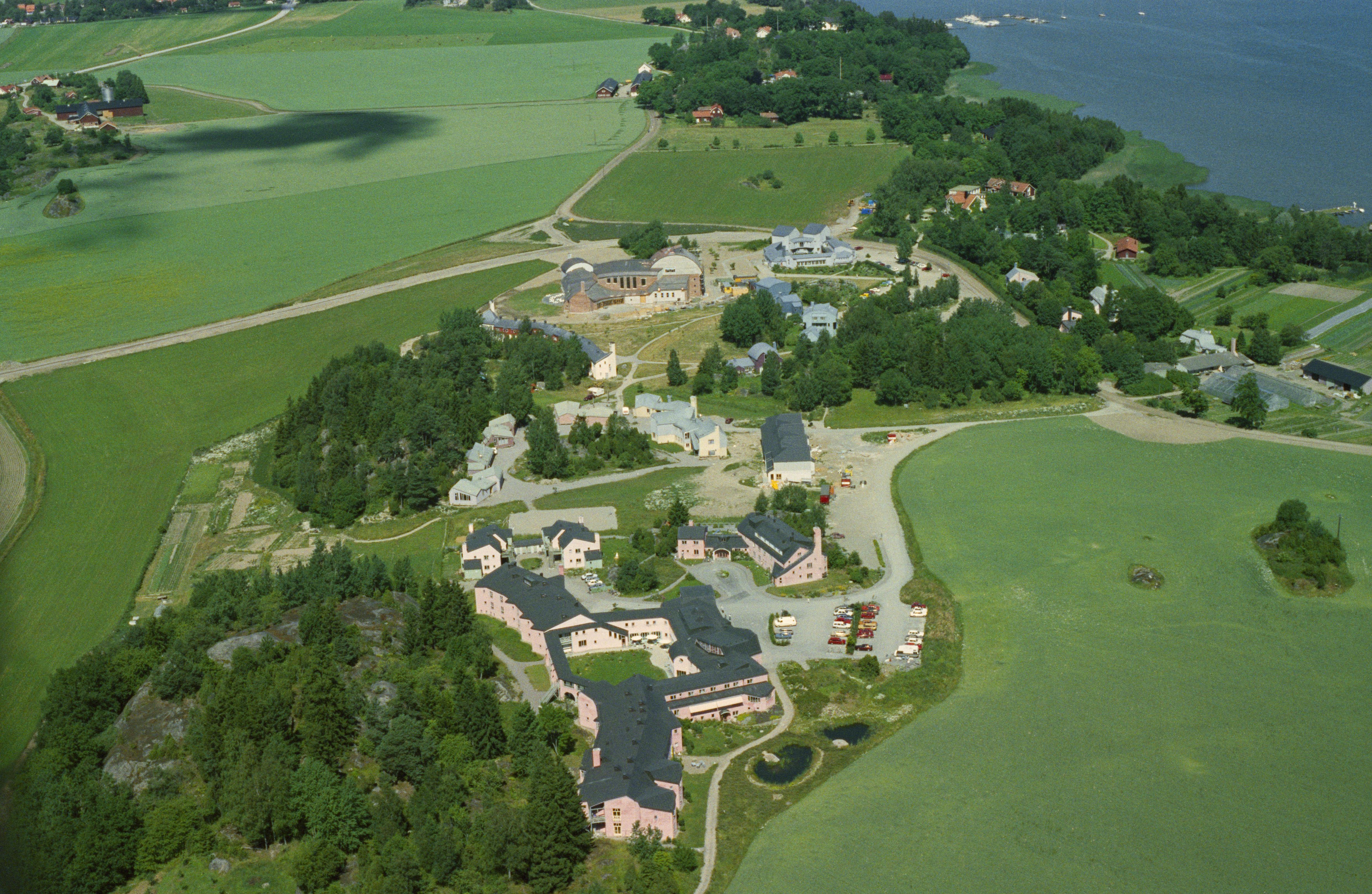 Beskrivning: Rudolf Steinerseminariet - Antroposofernas hus. Kulturhus, skola, sjukhuset Vidarkliniken, m.m. Norr i området gravfält RAÄnr Ytterjärna 134:1. Järnafjärden uppe till höger. Bilden är tagen mot (väderstreck): N