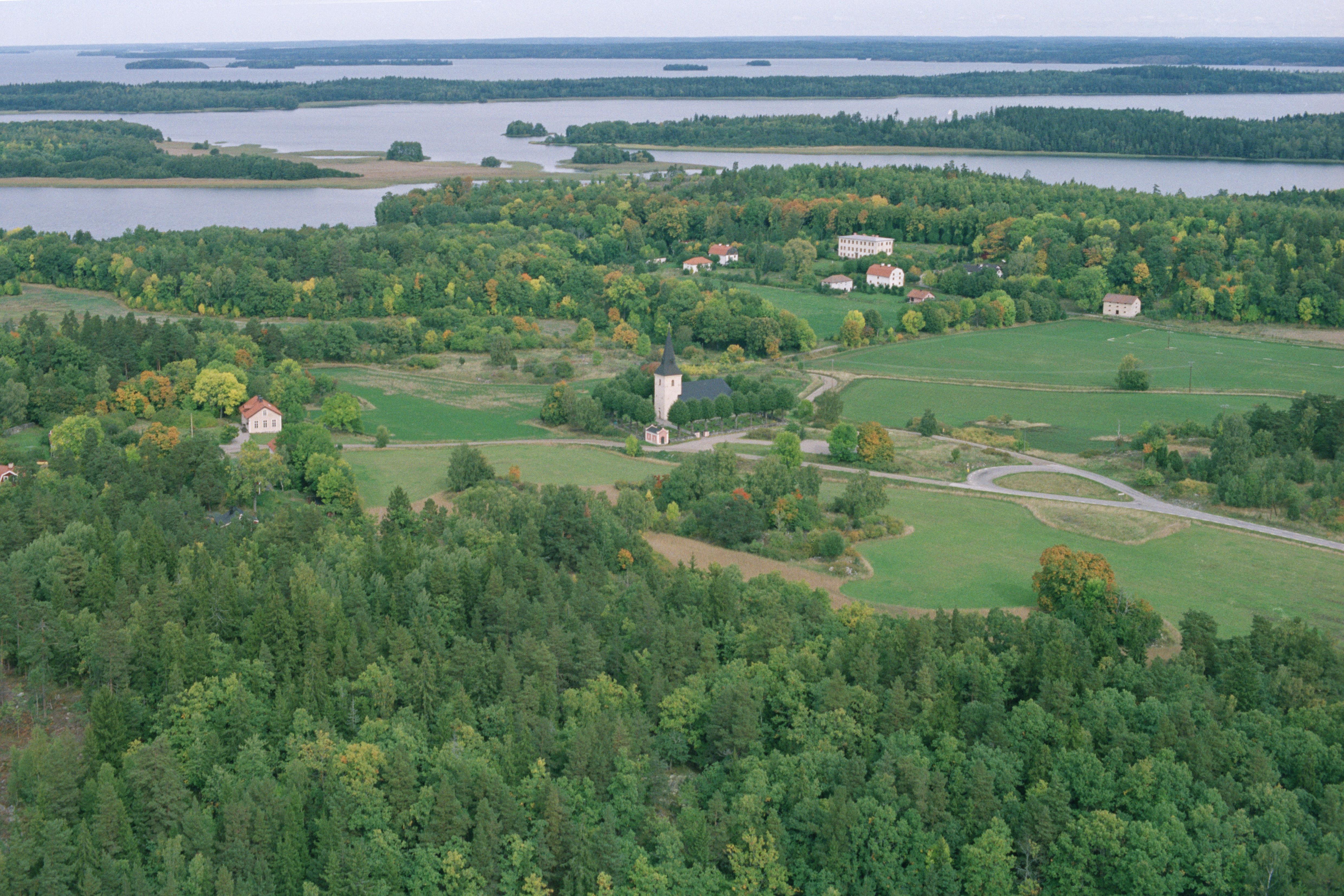 Beskrivning: Till vänster om bildens mitt Överenhörna hembygdsgård. Överenhörna kyrka vid bildens mitt. Över bildens mitt bytomt Husby backe RAÄnr Överenhörna 61:1-4. I bildens övre del Ekensbergs herrgård vid Hornboviken i Mälaren. Bilden är tagen mot (väderstreck): NO