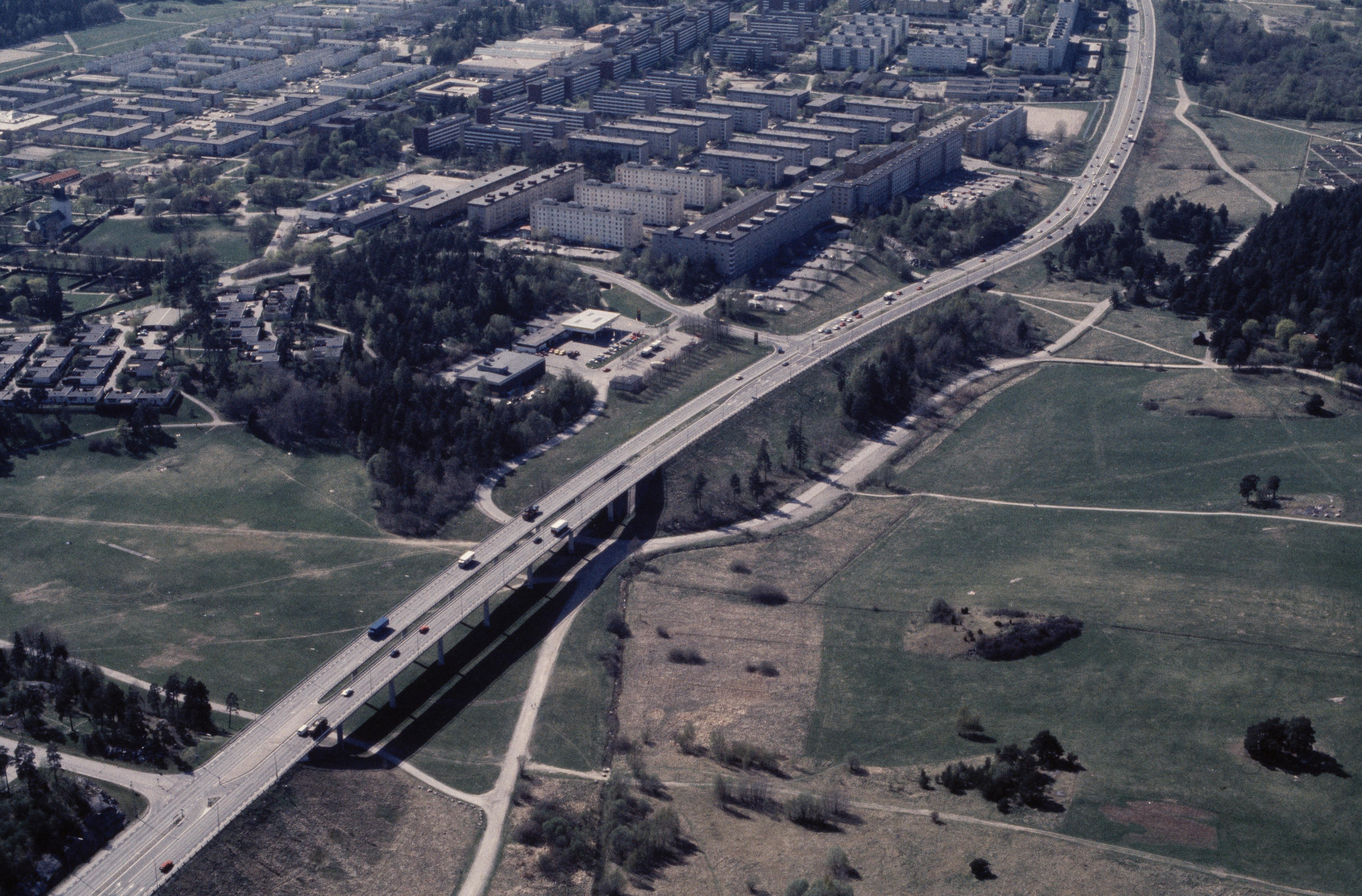 Beskrivning: (Tid. Spånga socken). Viadukt på väg E18 mellan Rinkeby - Spånga - Tensta. Spånga kyrka till vänster. Till höger Eggeby med gravfält Tallbacken RAÄnr Spånga 86:1. Bilden är tagen mot (väderstreck): VSV