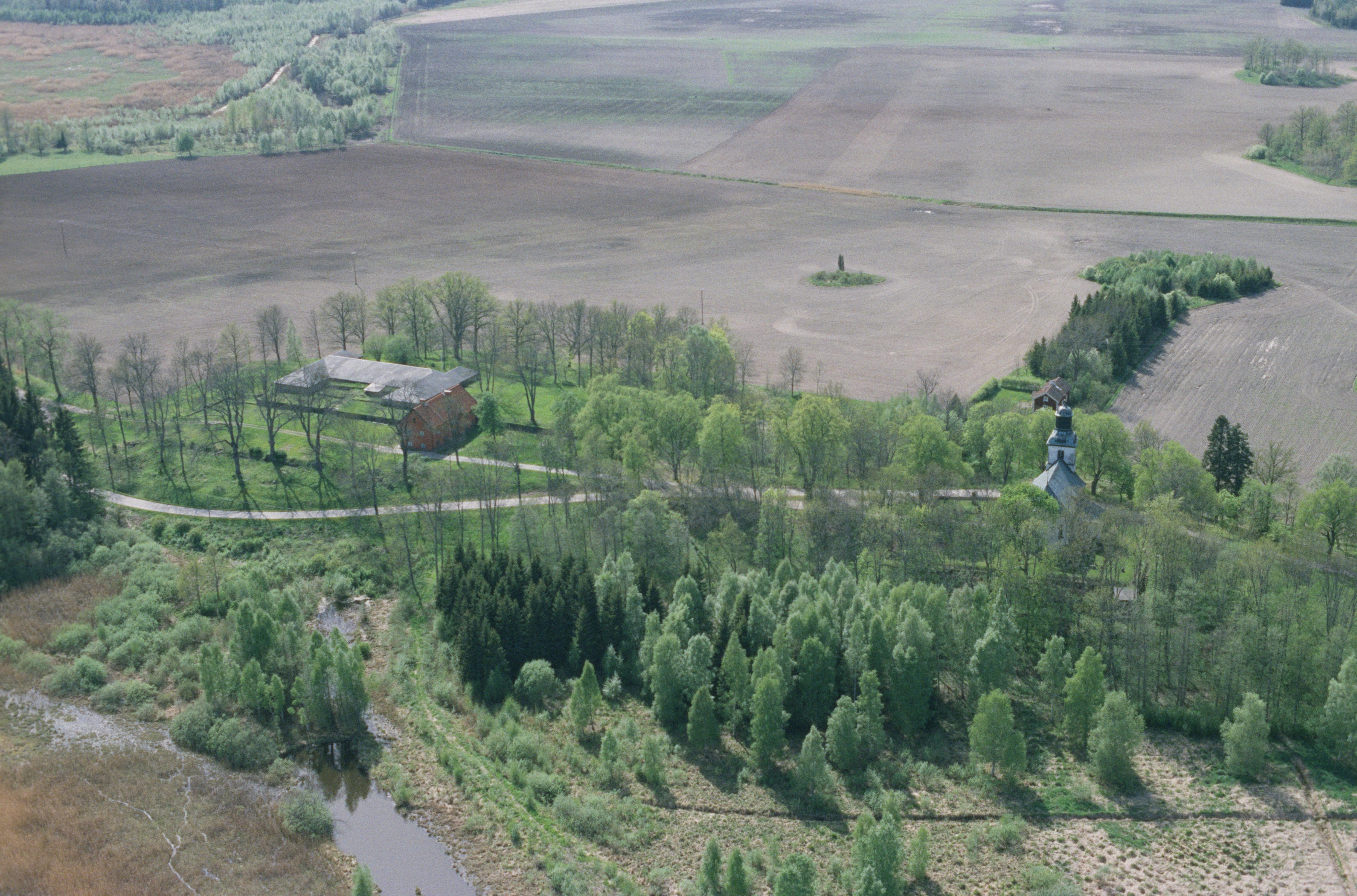 Beskrivning: Slottsruin Kägleholm RAÄnr Ödeby 8:1 (under grått skiffertak) och Ödeby kyrka vid sjön Väringen. Bilden är tagen mot (väderstreck): VSV