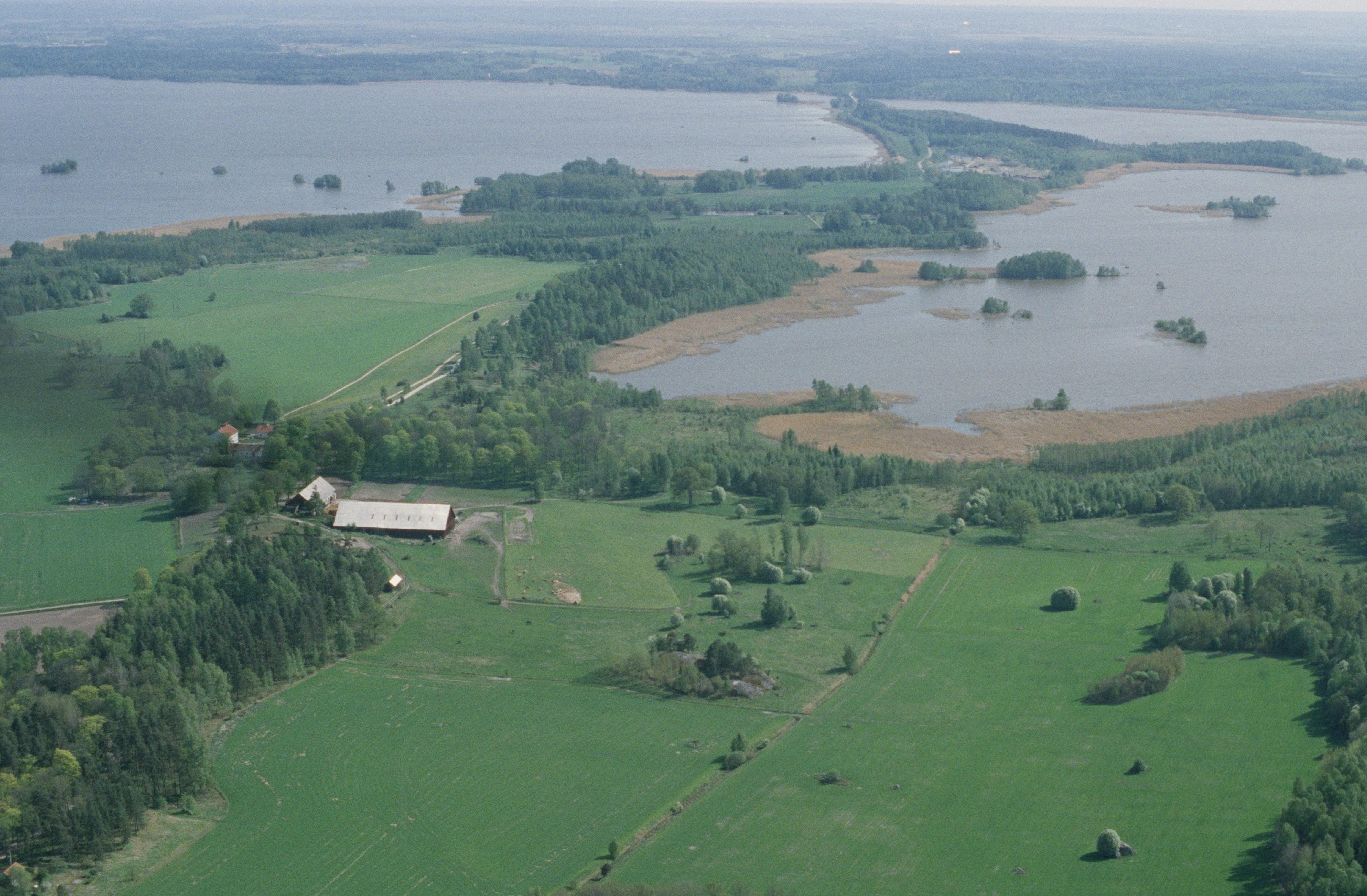 Beskrivning: Skävesunds herrgård vid sjön Hjälmaren. Gubbskogen med gravfält RAÄnr Glanshammar 2:1 och Norra Skäret vid bildens mitt. På udden i bildens övre del Äsön i Stora Mellösa socken. Bilden är tagen mot (väderstreck): S
