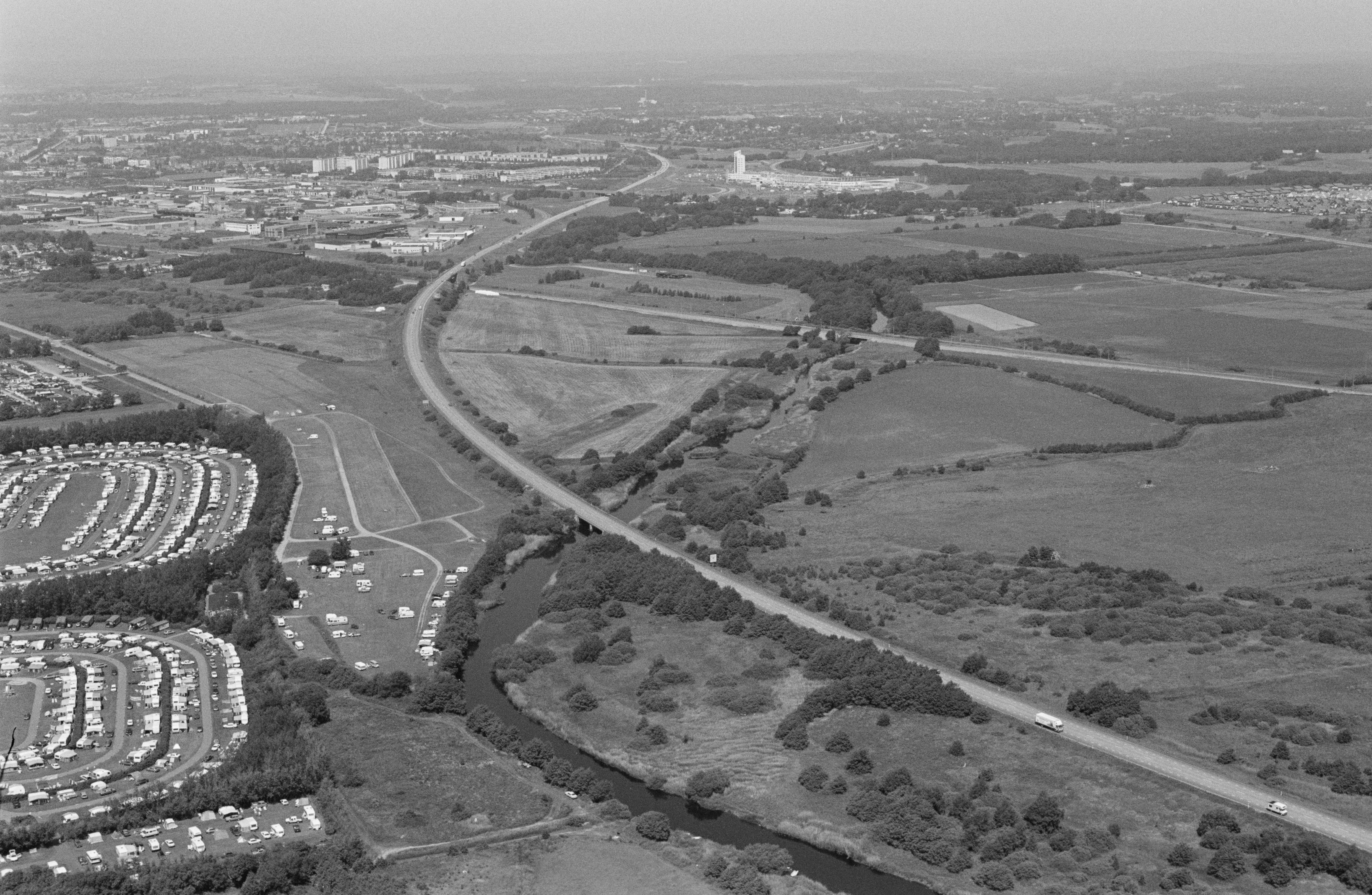 Beskrivning: Fylleån vid Hagön på gränsen mellan socken Halmstad (till v.), Trönninge (till h.) och Snöstorp (bildens övre del). Boplats RAÄnr Snöstorp 104:1 vid bildens mitt. Bilden är tagen mot (väderstreck): N