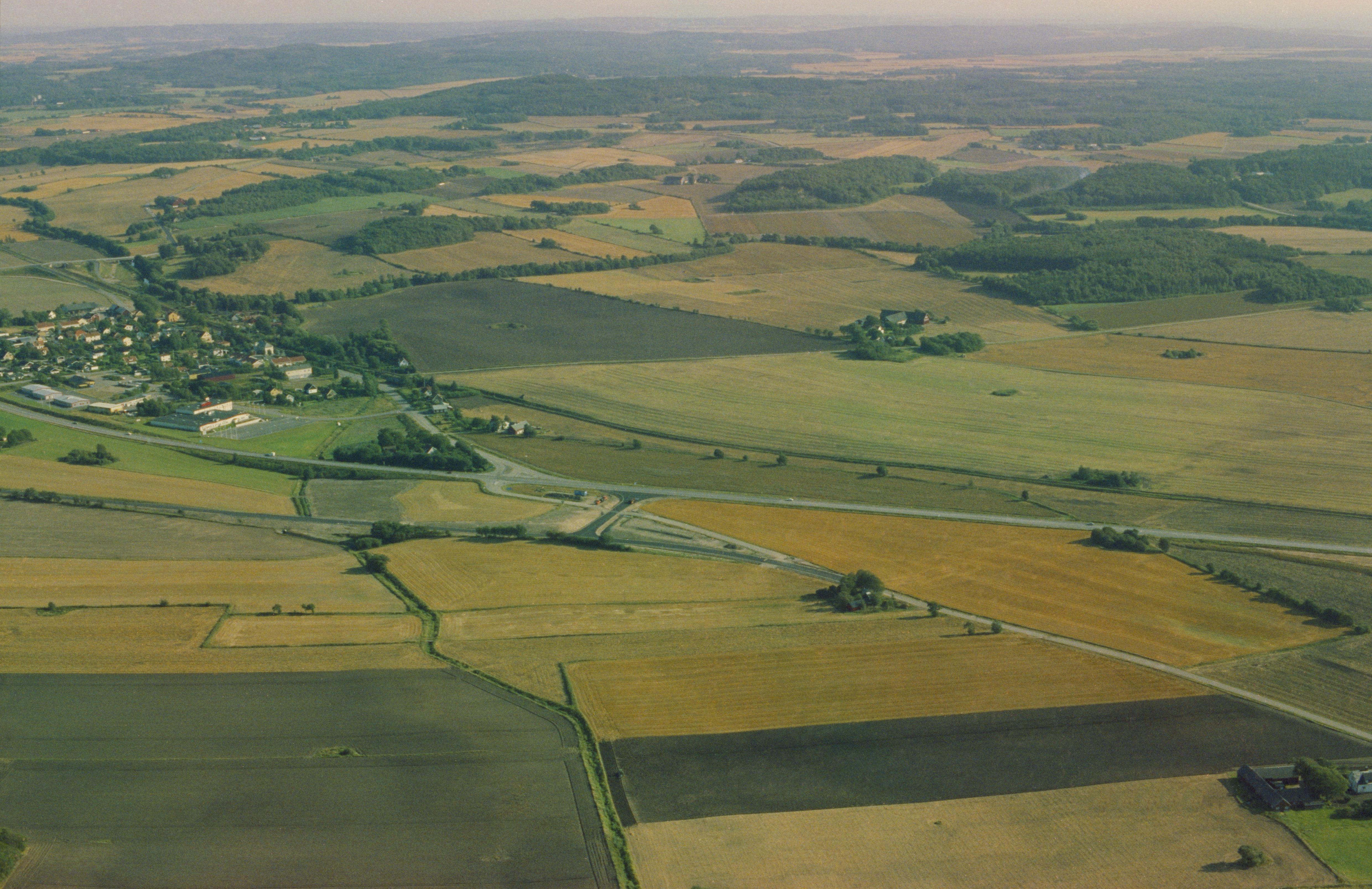 Beskrivning: Vid gränsen mellan socknen Årstad, Eftra, (uppe till vänster) och Skrea (uppe till höger). Väg E6 byggs vid området Broen, söder om Heberg. Bilden är tagen mot (väderstreck): SV