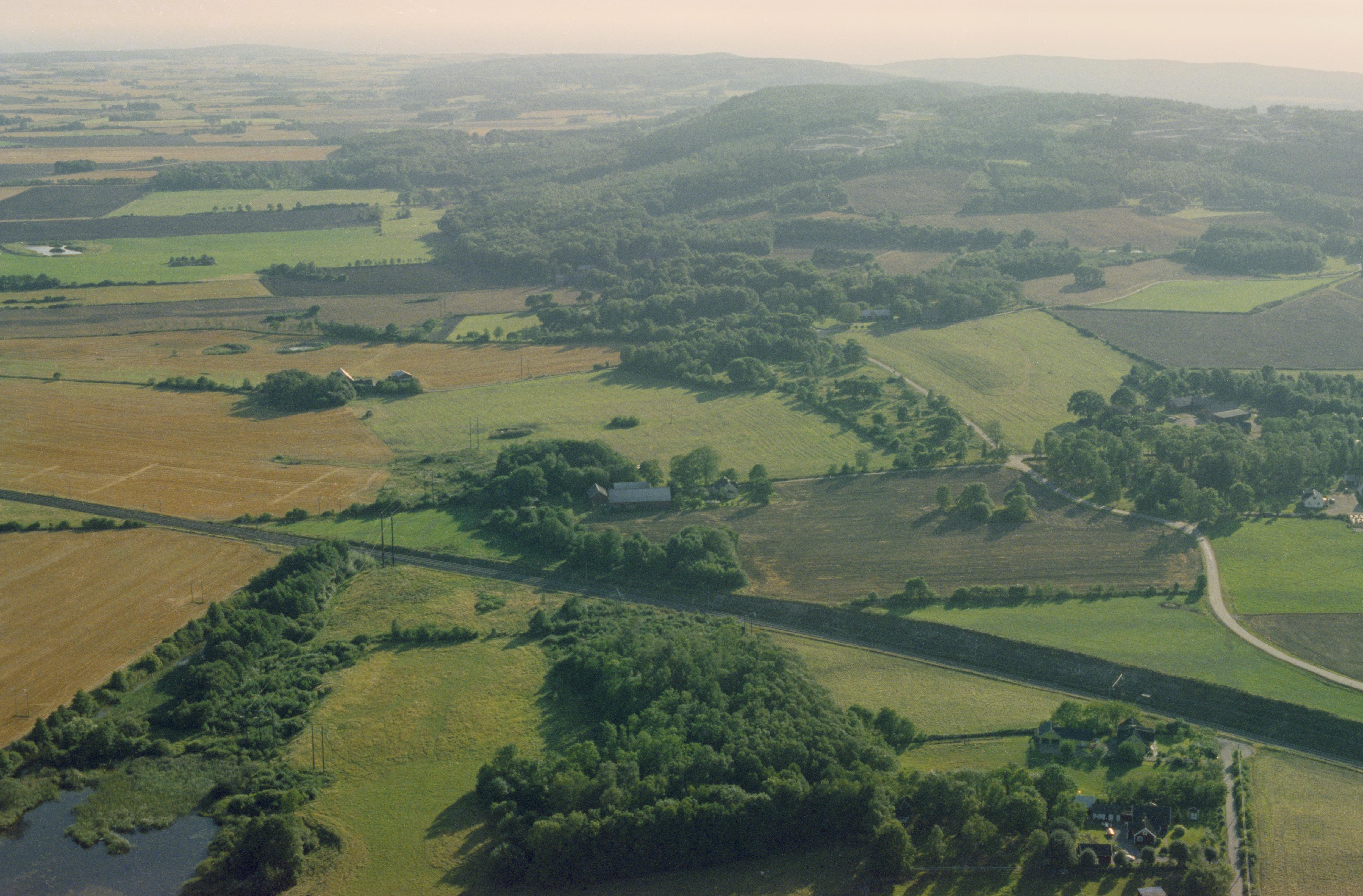 Beskrivning: Vid Hörsås - Lilla Berg - Öringe, innan bygge av väg E6 mellan Laholm och Slöinge. Område med högar och fornåkrar bl.a RAÄnr Getinge 26:1. Bilden är tagen mot (väderstreck): SV