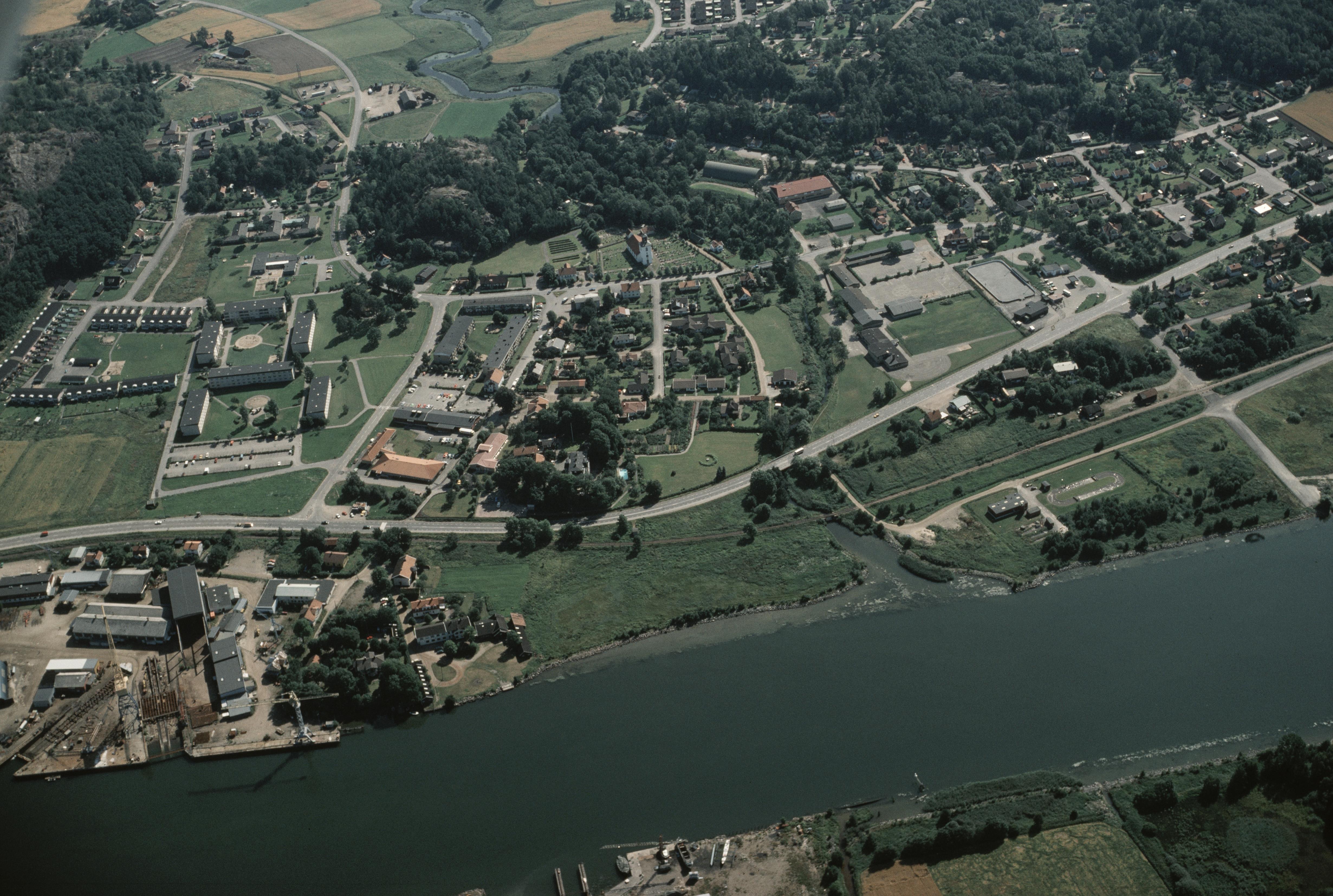 Beskrivning: Lödöse tätort vid Göta älv. Sankt Peders kyrka vid bildens mitt. Bilden är tagen mot (väderstreck): Ö