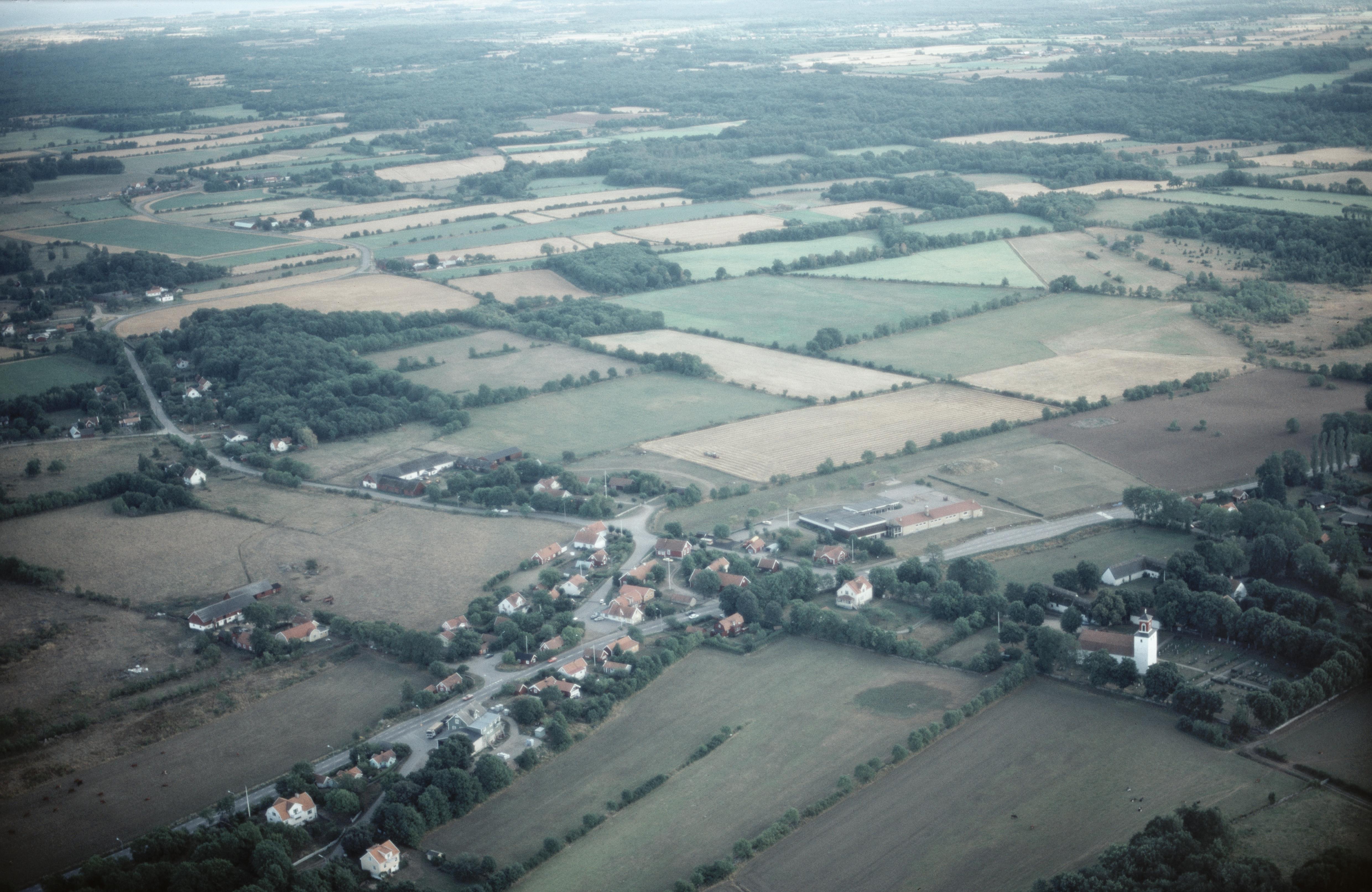 Beskrivning: Glömminge kyrka och kyrkby. Åker öster om vägen vid Strandskogen. Bilden är tagen mot (väderstreck): SO