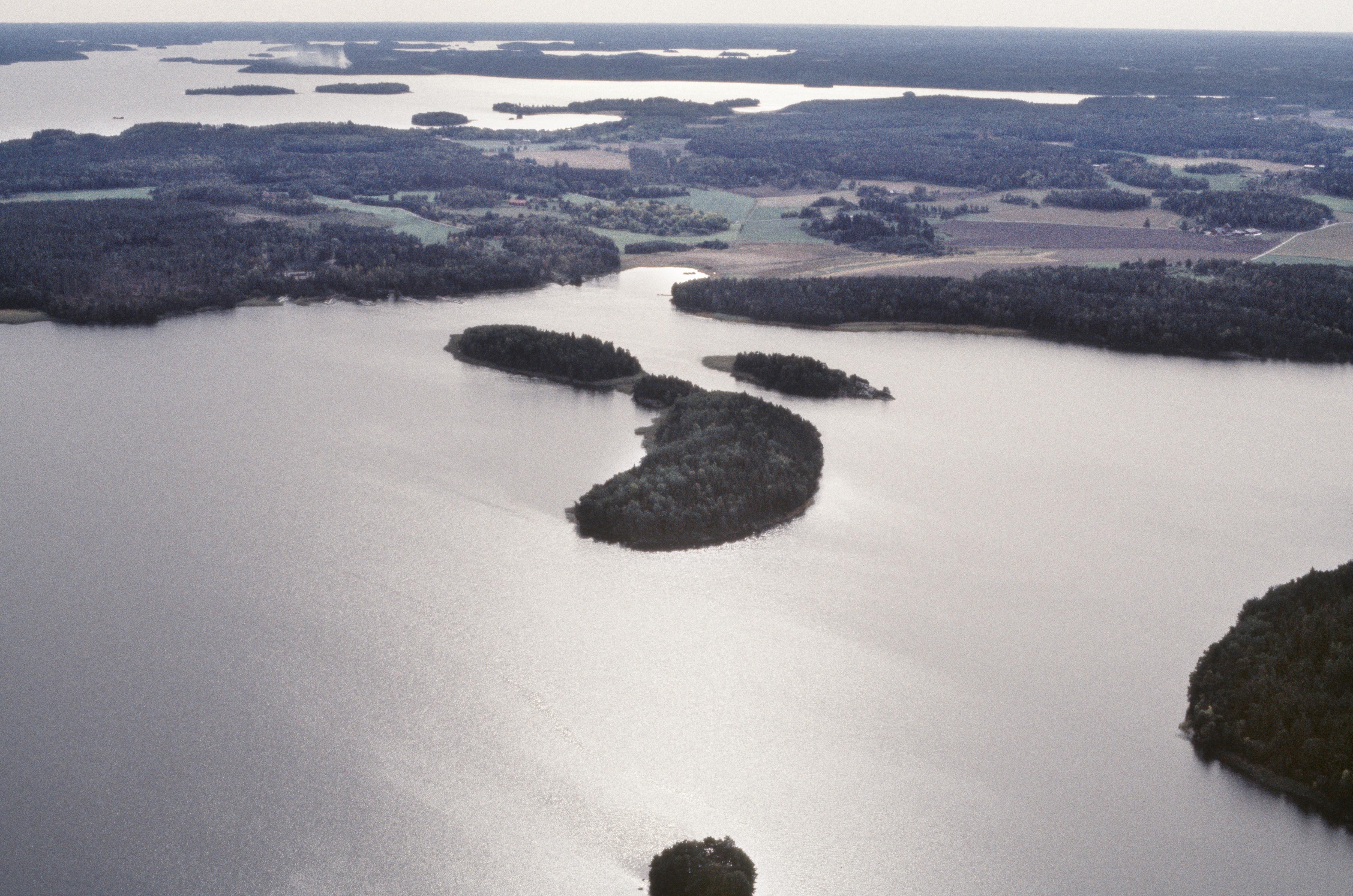 Beskrivning: Vid bildens mitt holmarna Lindholmen, Häggen och Skarpan i Näsbyviken / Ringsösundet i Mälaren. Mellan holmarna skeppsvrak RAÄnr Ytterselö 360. Näsby tegelbruk till vänster vid bildens mitt. I bildens övre del området vid Mälsåkers slott. Bilden är tagen mot (väderstreck): S