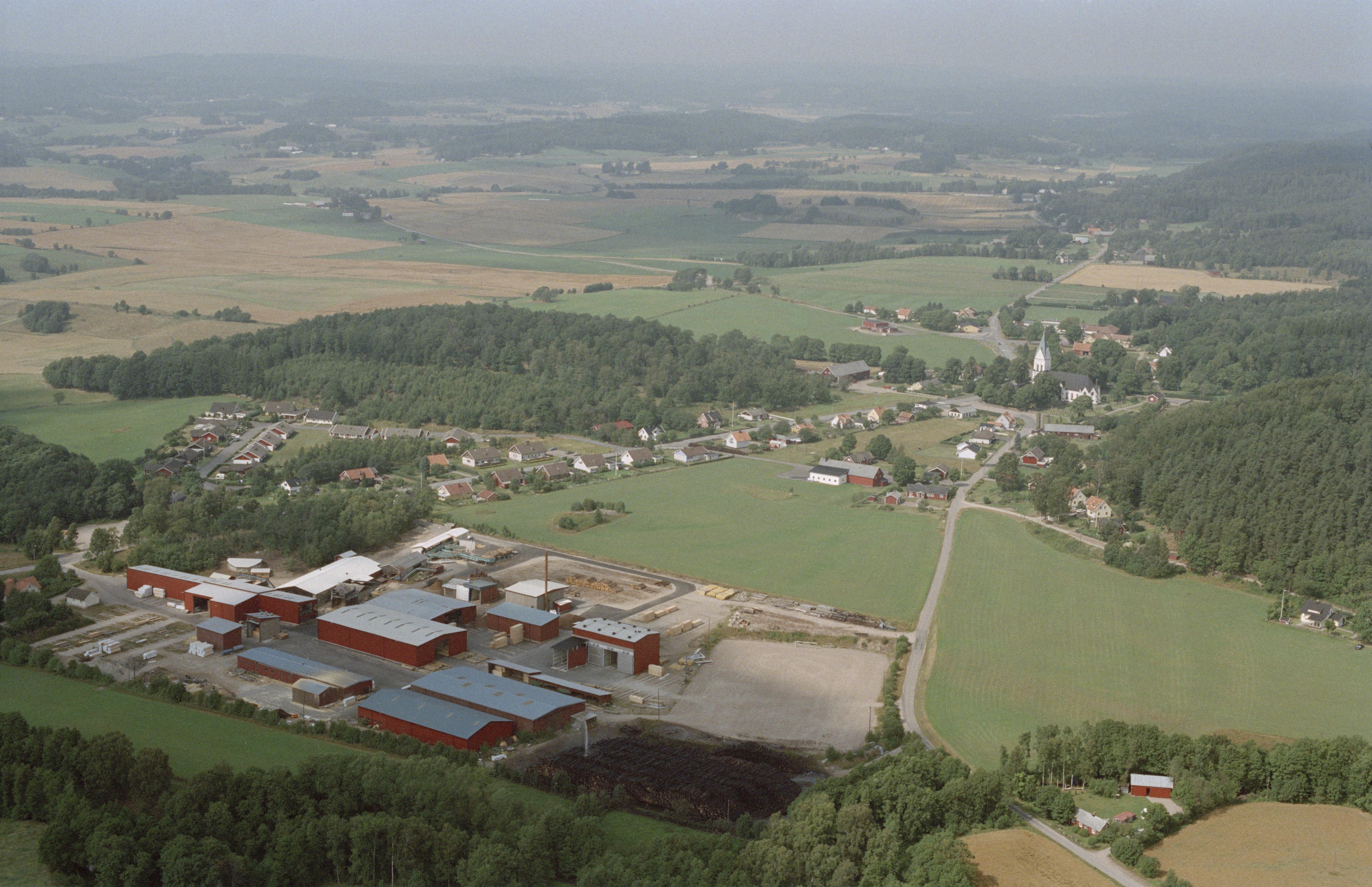 Beskrivning: Okome kyrka (uppe till höger) och kyrkby i Ätradalen. Bilden är tagen mot (väderstreck): N