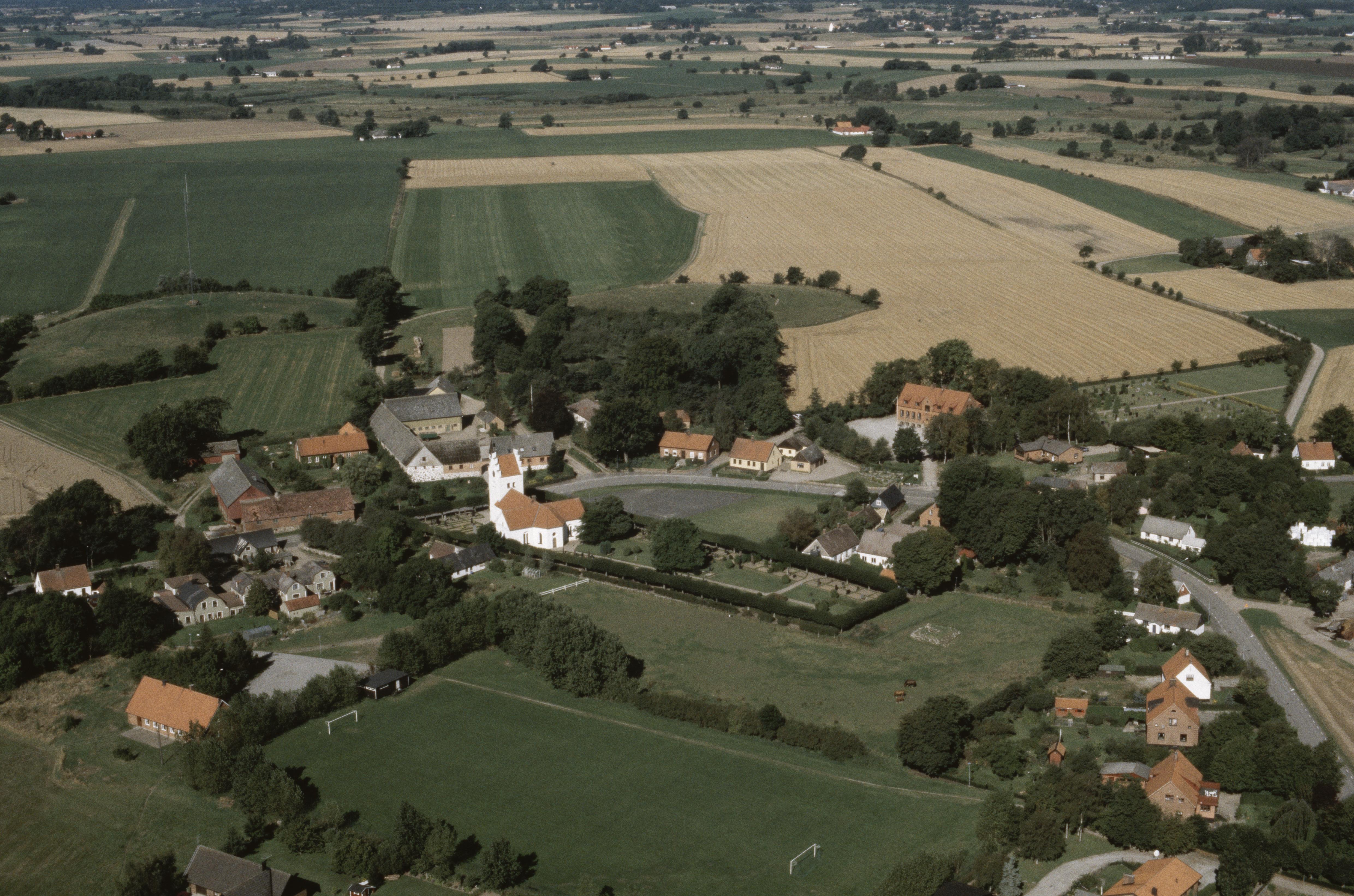 Beskrivning: Gladsax kyrka och kyrkby. Bilden är tagen mot (väderstreck): V