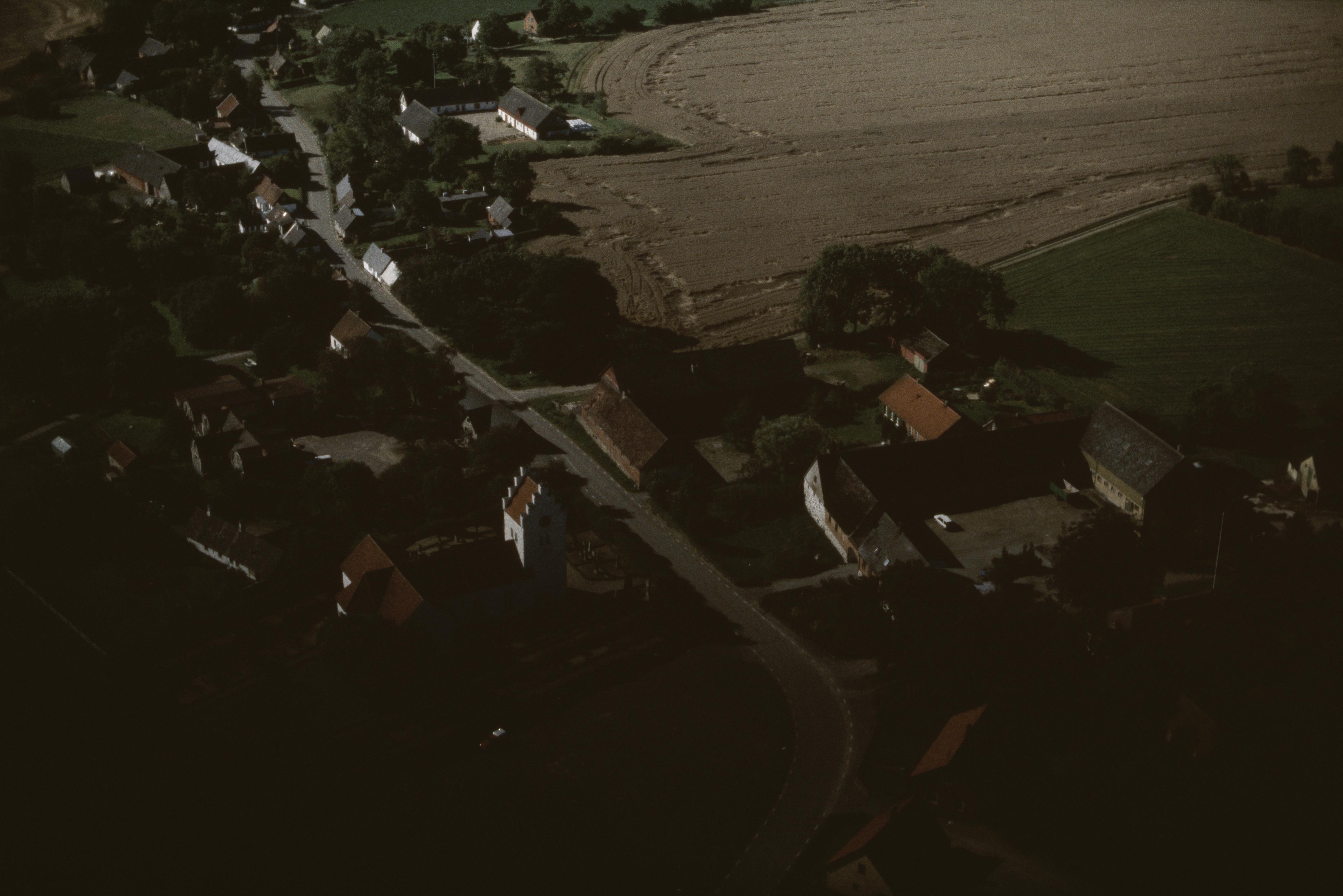 Beskrivning: Gladsax kyrka och kyrkby. Bilden är tagen mot (väderstreck): SSV (NB: Diabilden är skadat / mycket mörk.)
