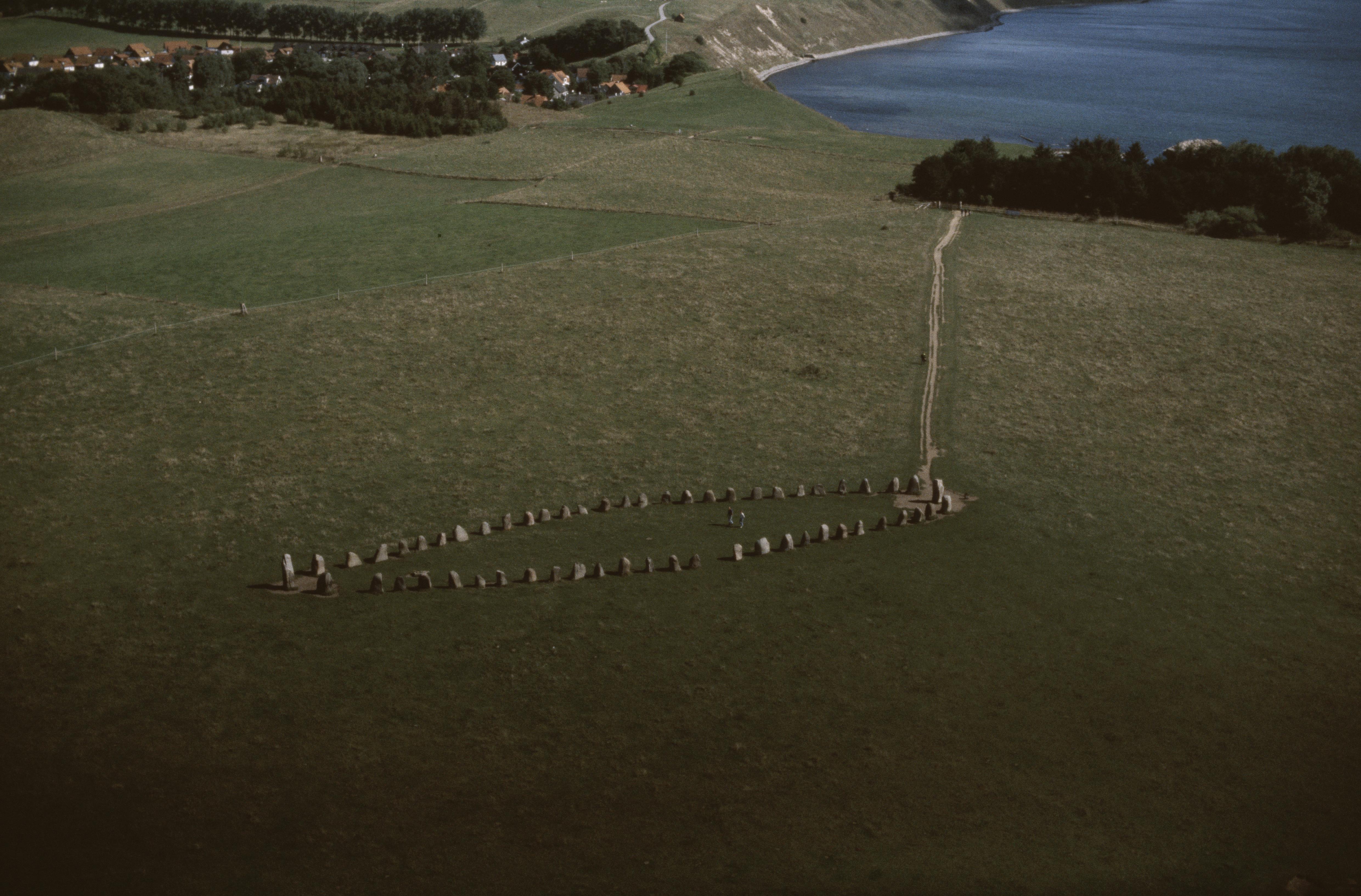 Beskrivning: Skeppssättningen Ales stenar RAÄnr Valleberga 20:1 vid Kåseberga. Bilden är tagen mot (väderstreck): Ö