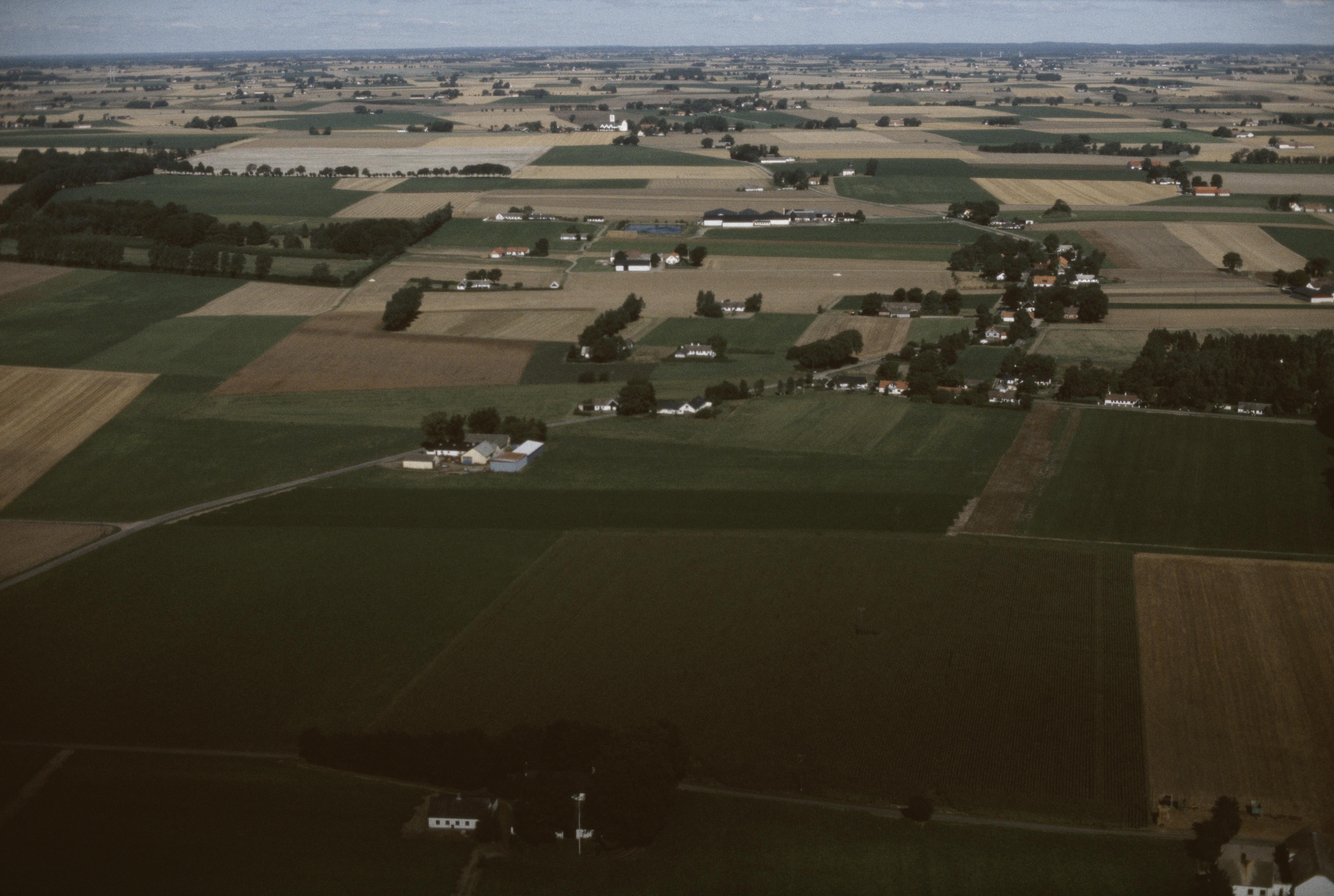 Beskrivning: (NB! Bilden är skadat = mycket mörk). Peppinge by. Valleberga kyrka i bildens övre del. Bilden är tagen mot (väderstreck): N