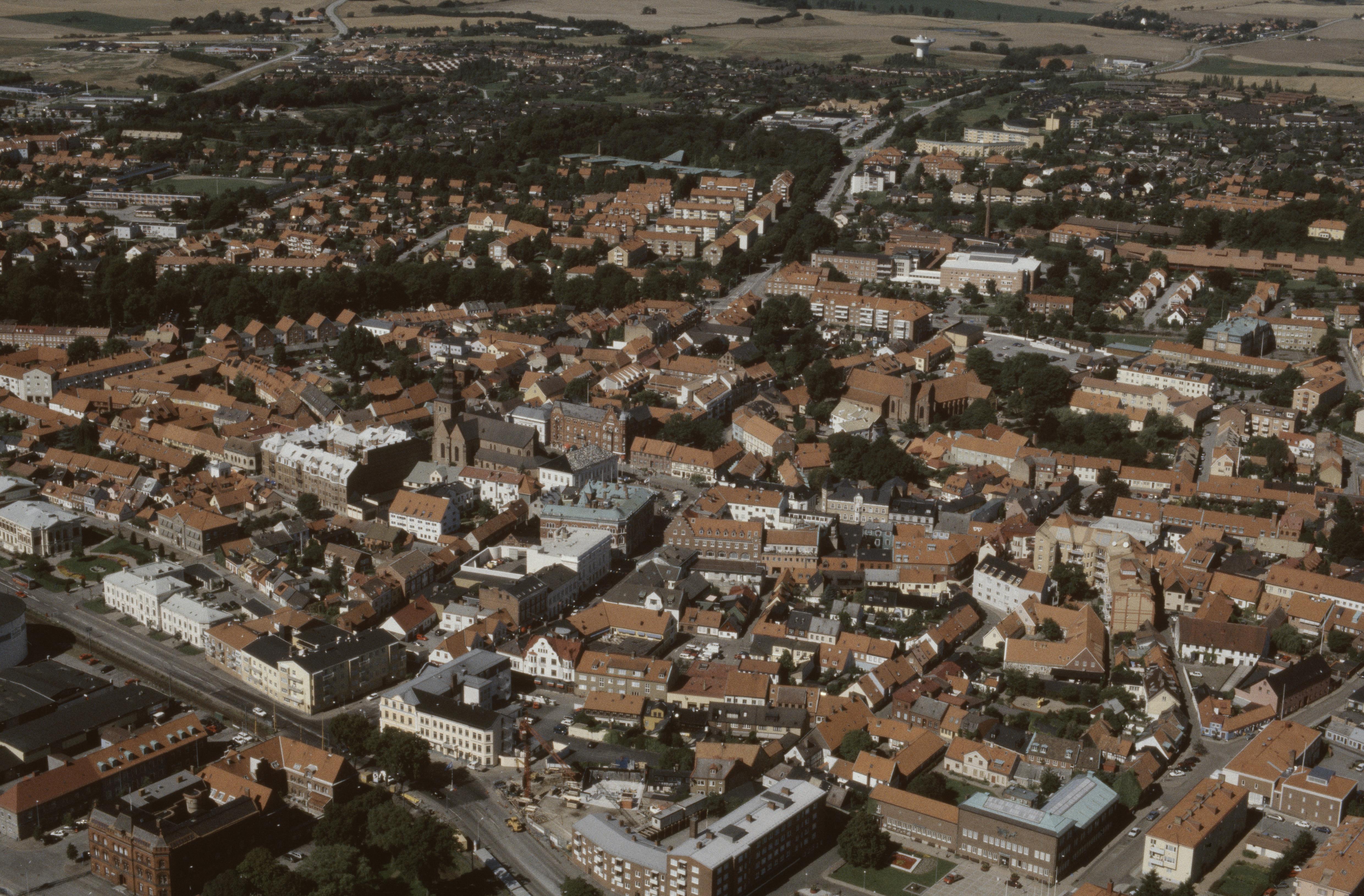 Beskrivning: Ystads stad. Sankta Maria kyrka till vänster om bildens mitt. Sankt Petri kyrka över bildens mitt. Bilden är tagen mot (väderstreck): V