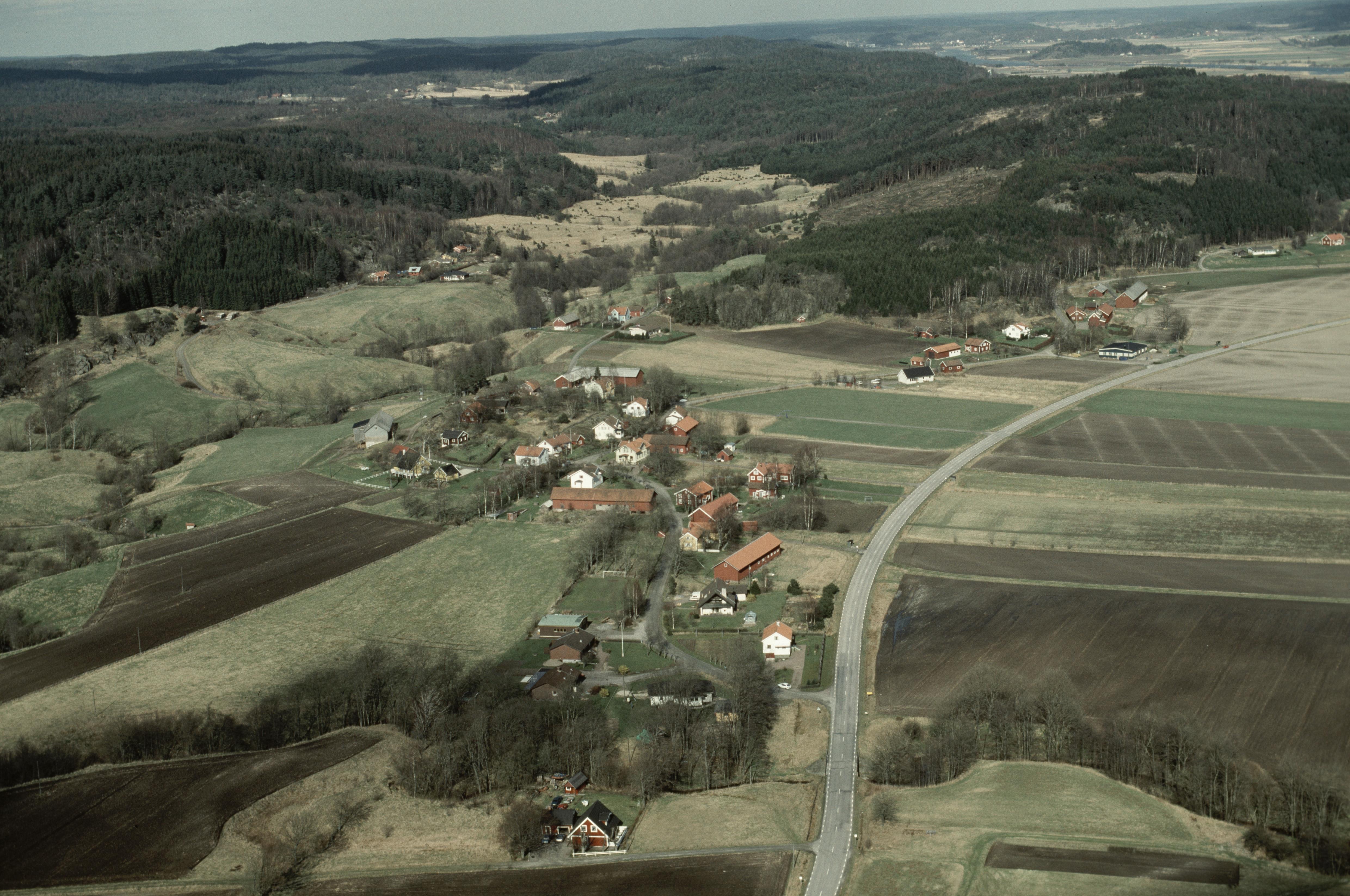 Solbergsån mot utloppet i Göta älv (till höger utanför bild). Bytomt RAÄnr Romelanda 159:1 i Solbergs by i bildens övre del. Bilden är tagen mot (väderstreck): NO