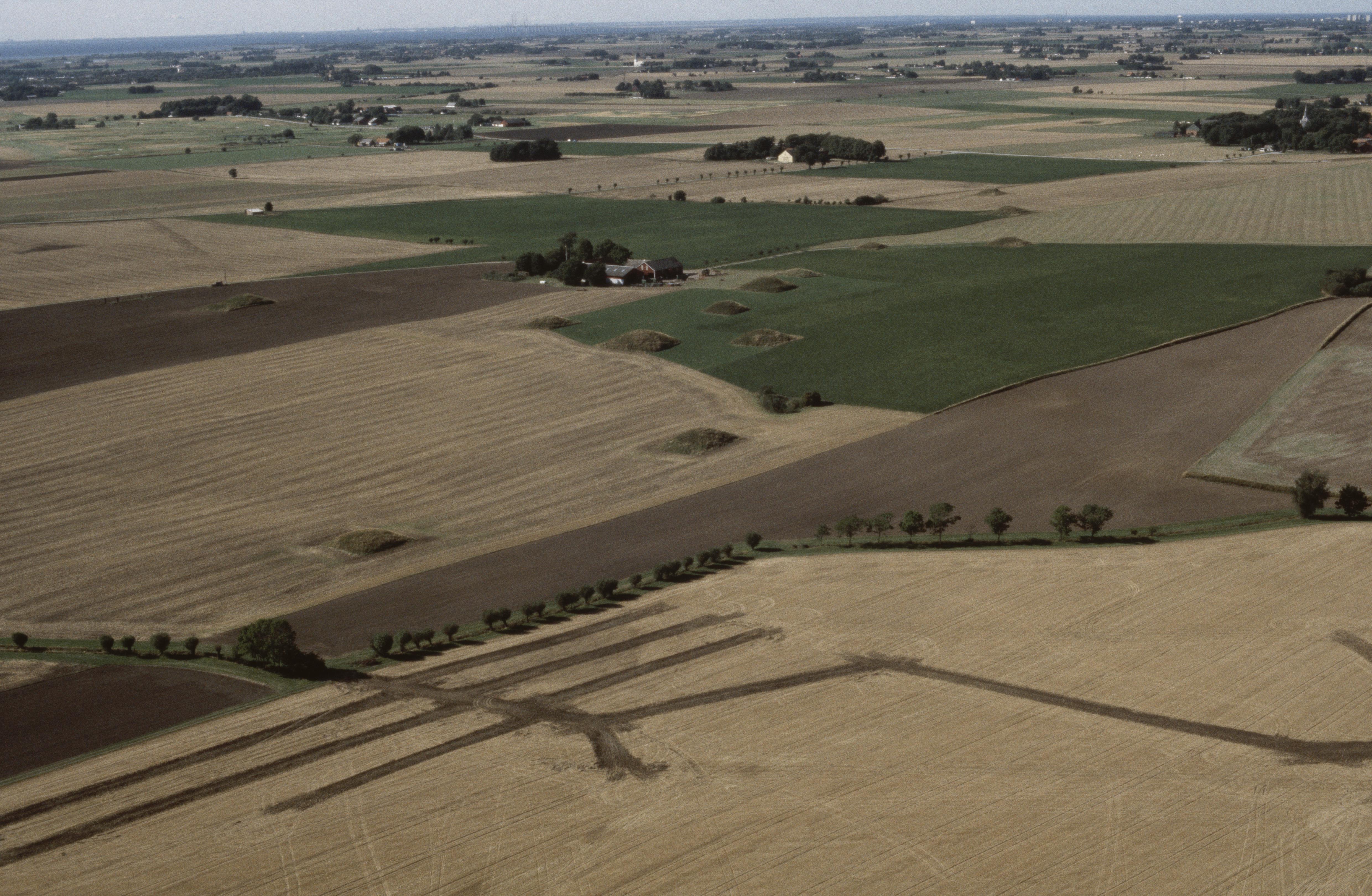Beskrivning: Steglarps gravfält med flera bronsåldershögar: Sandhög RAÄnr Fuglie 9:1, Lillehög Fuglie 8:1, Storehög Fuglie 8:2, Grytehög Fuglie 11:1 och Fuglie 6:1, 7:1, 9:1, 14:1 m.fl. Bilden är tagen mot (väderstreck): NV