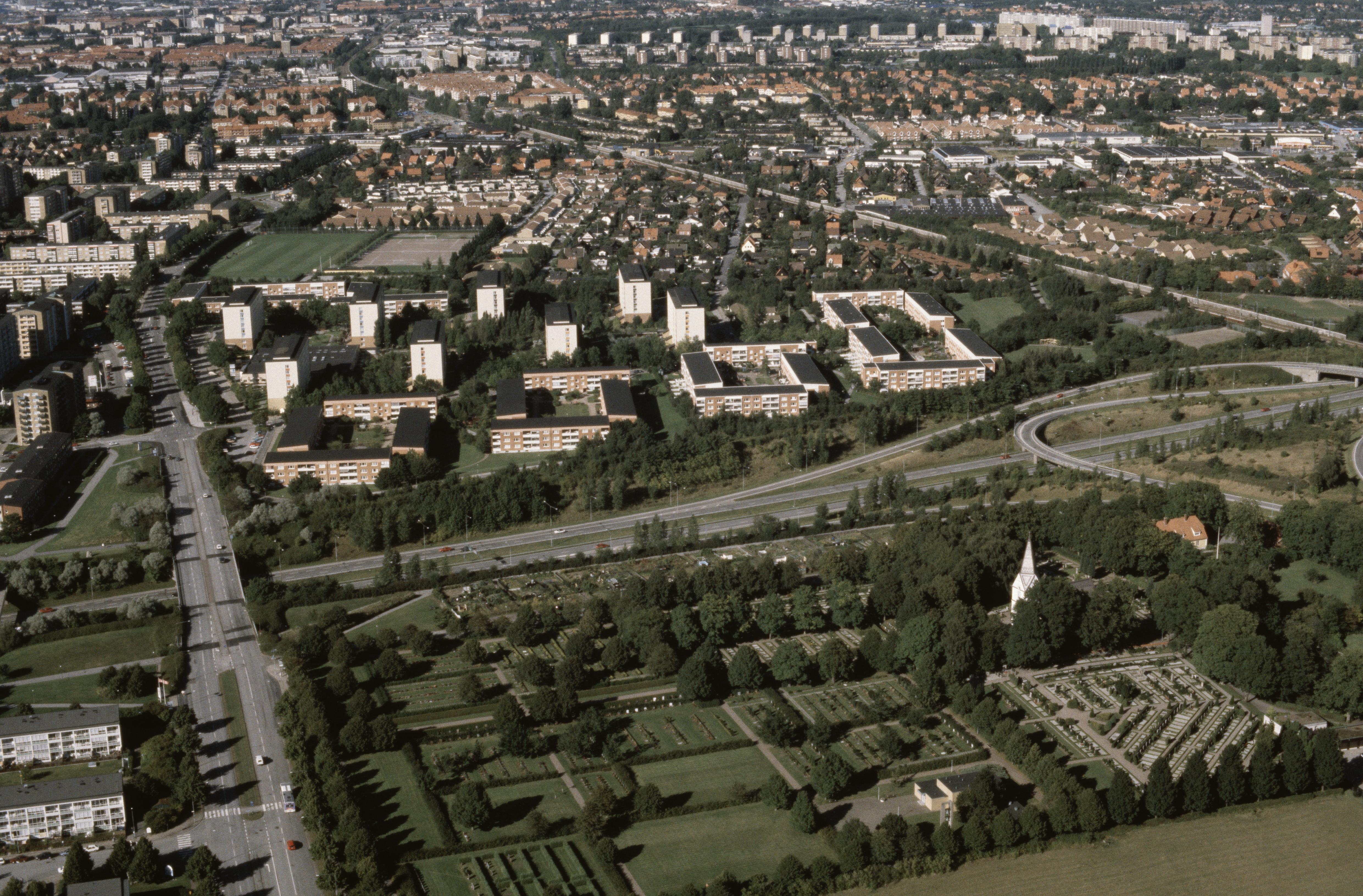 Beskrivning: Stadsdelen Fosie (tidigare Fosie socken) i Malmö stad. Fosie kyrka nere till höger. Bilden är tagen mot (väderstreck): NNO