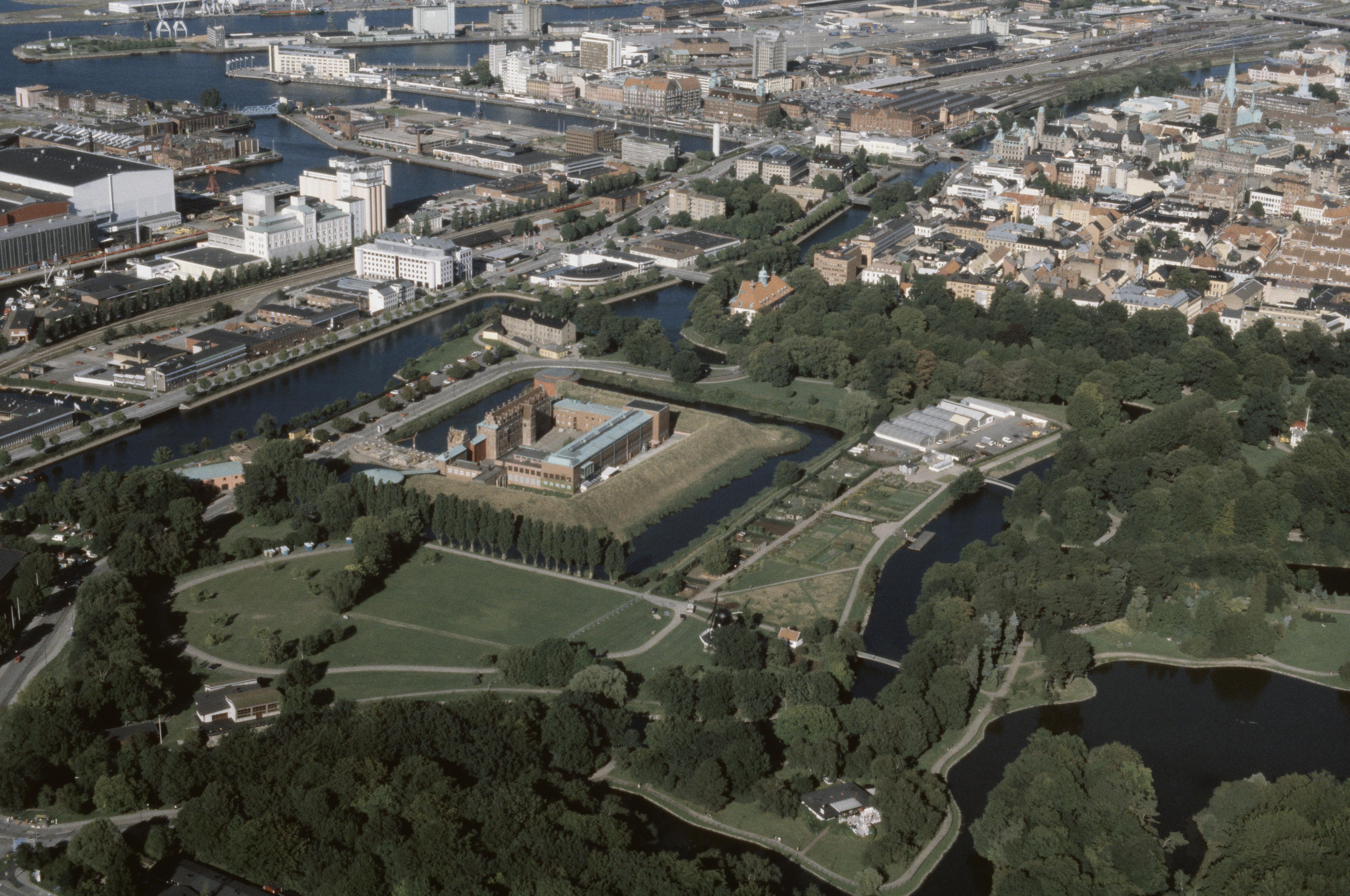 Beskrivning: Malmö stad. Malmöhus slott i bildens mitt. I bildens övre del Hamnkanalen vid Gamla staden och Sankt Petri kyrka. Bilden är tagen mot (väderstreck): NO