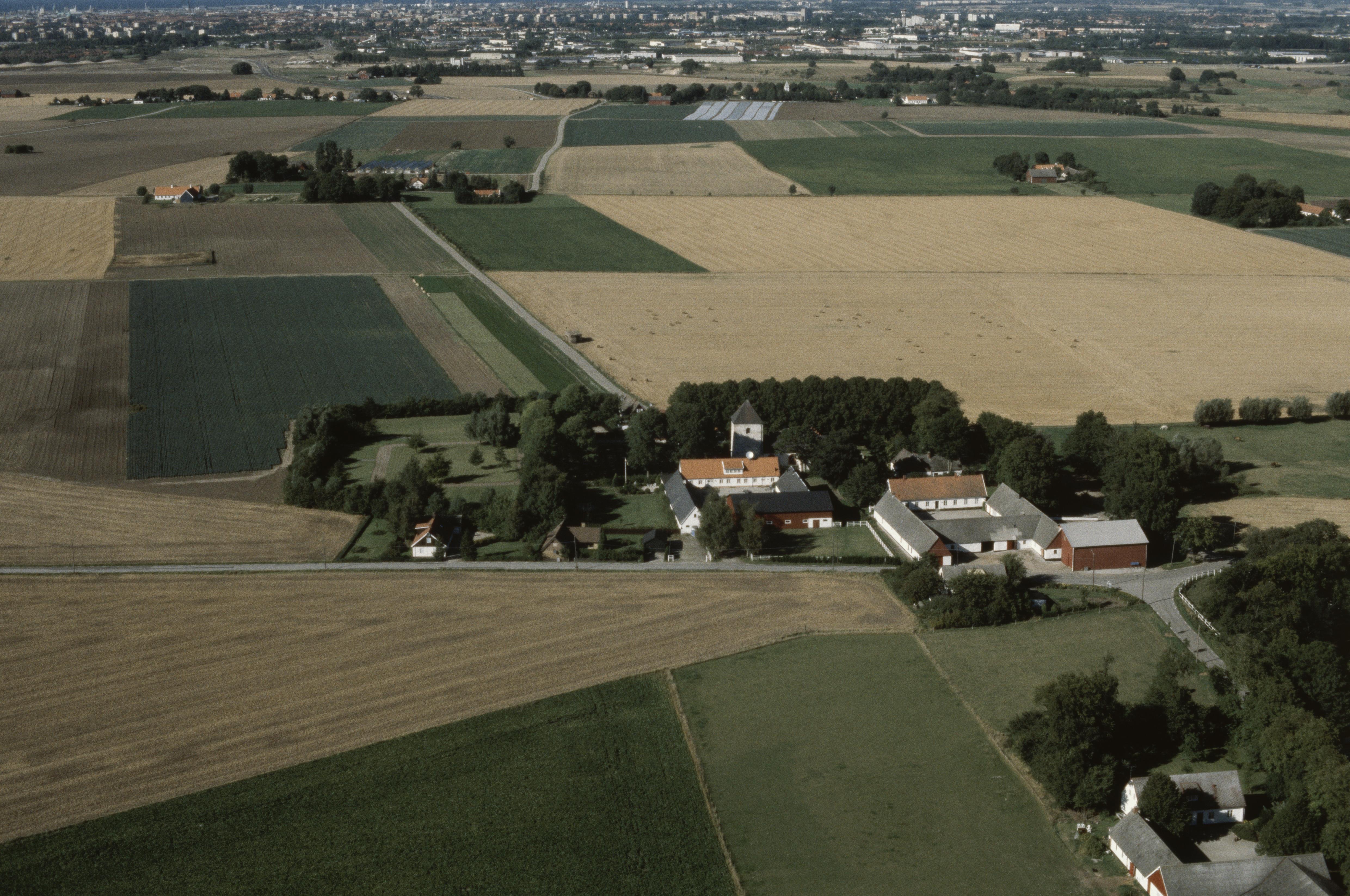 Beskrivning: Glostorps kyrka. I bildens övre del Malmö stad. Bilden är tagen mot (väderstreck): NNO