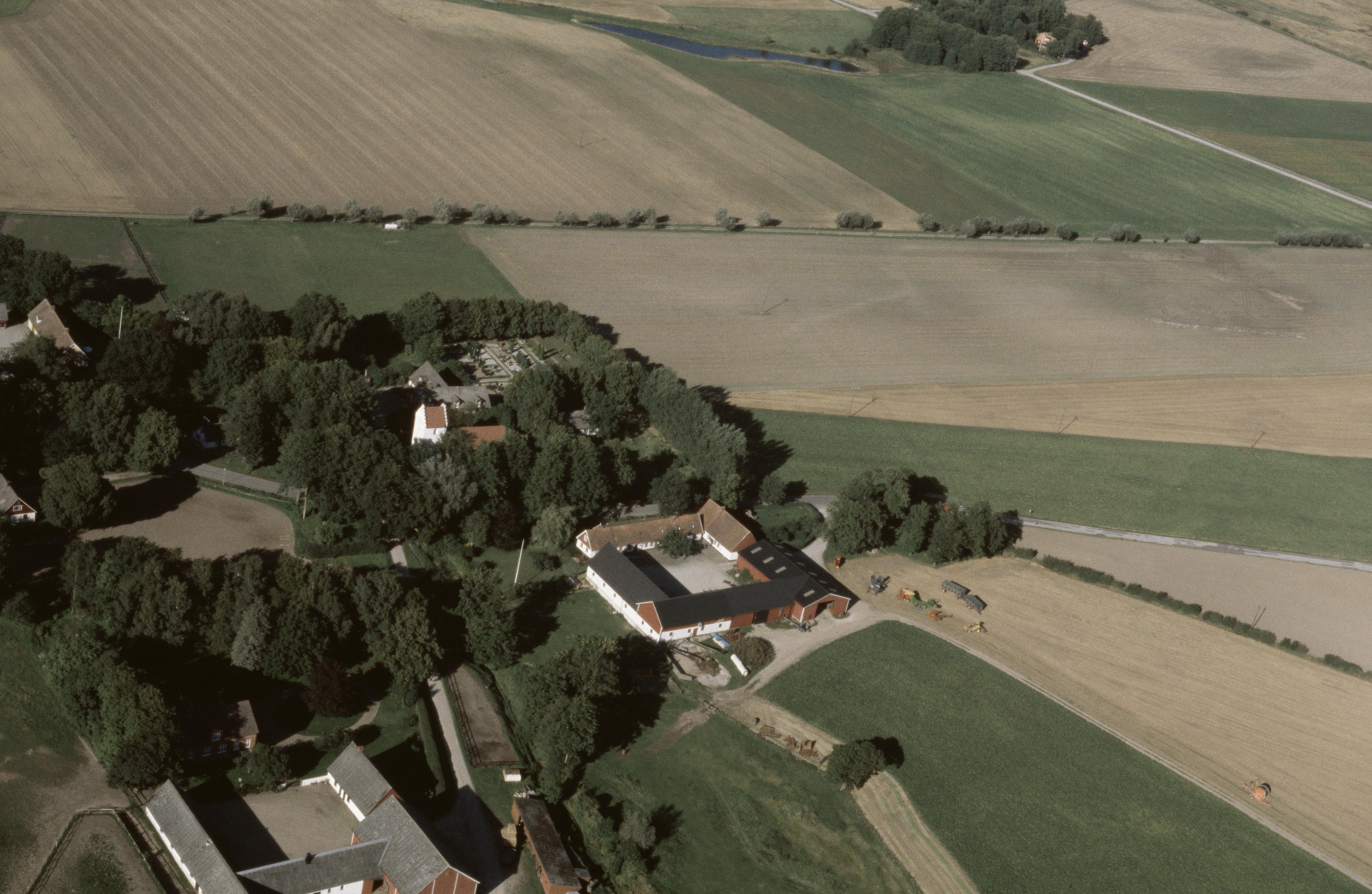 Beskrivning: Västra Hoby kyrka och kyrkby. Bilden är tagen mot (väderstreck): NO
