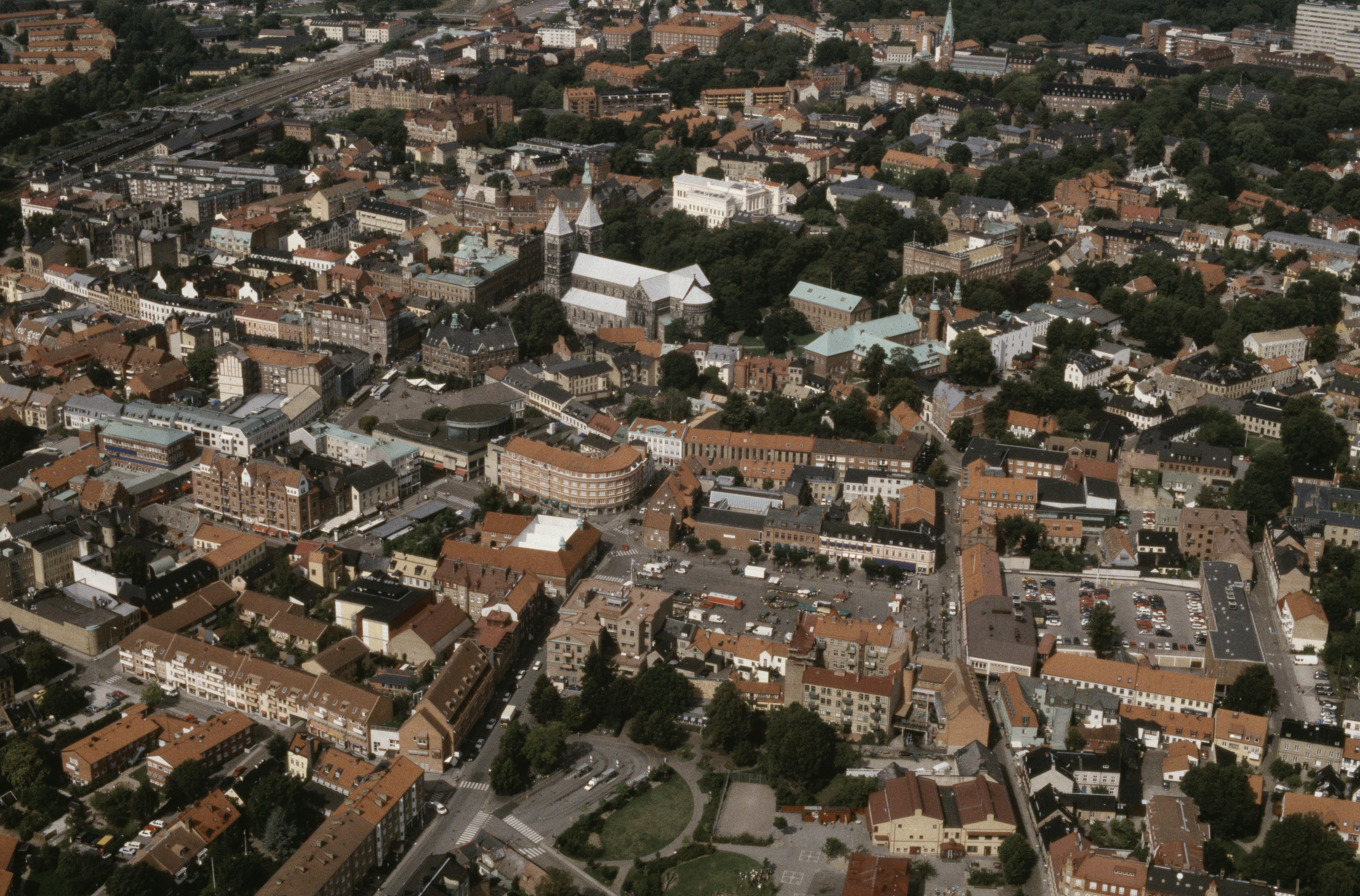 Beskrivning: Lunds stad. Lunds domkyrka vid bildens mitt. Uppe till höger Allhelgonakyrkan. Bilden är tagen mot (väderstreck): NV