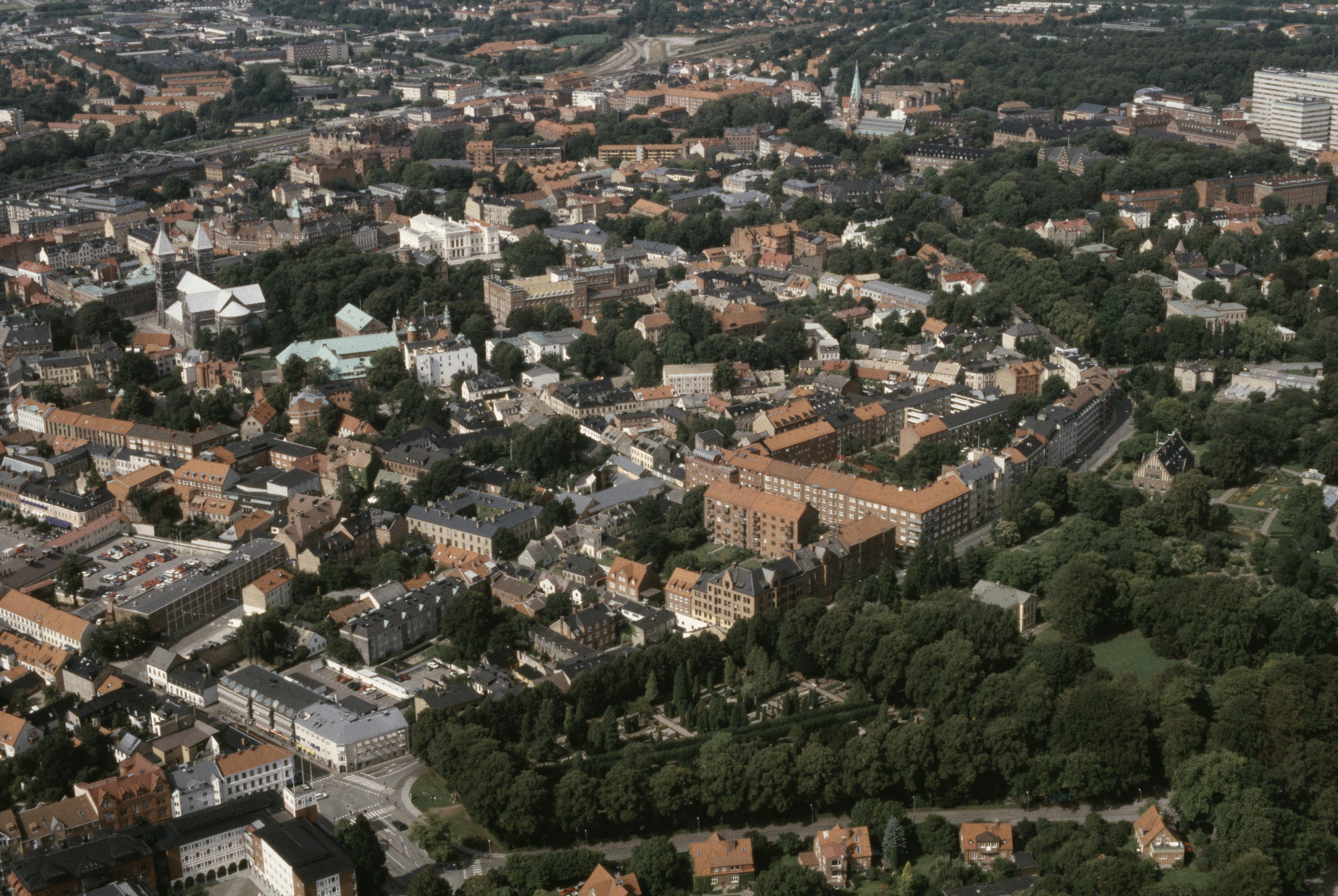 Beskrivning: Lunds stad. Lunds domkyrka till vänster. Uppe till höger Allhelgonakyrkan. Bilden är tagen mot (väderstreck): NV