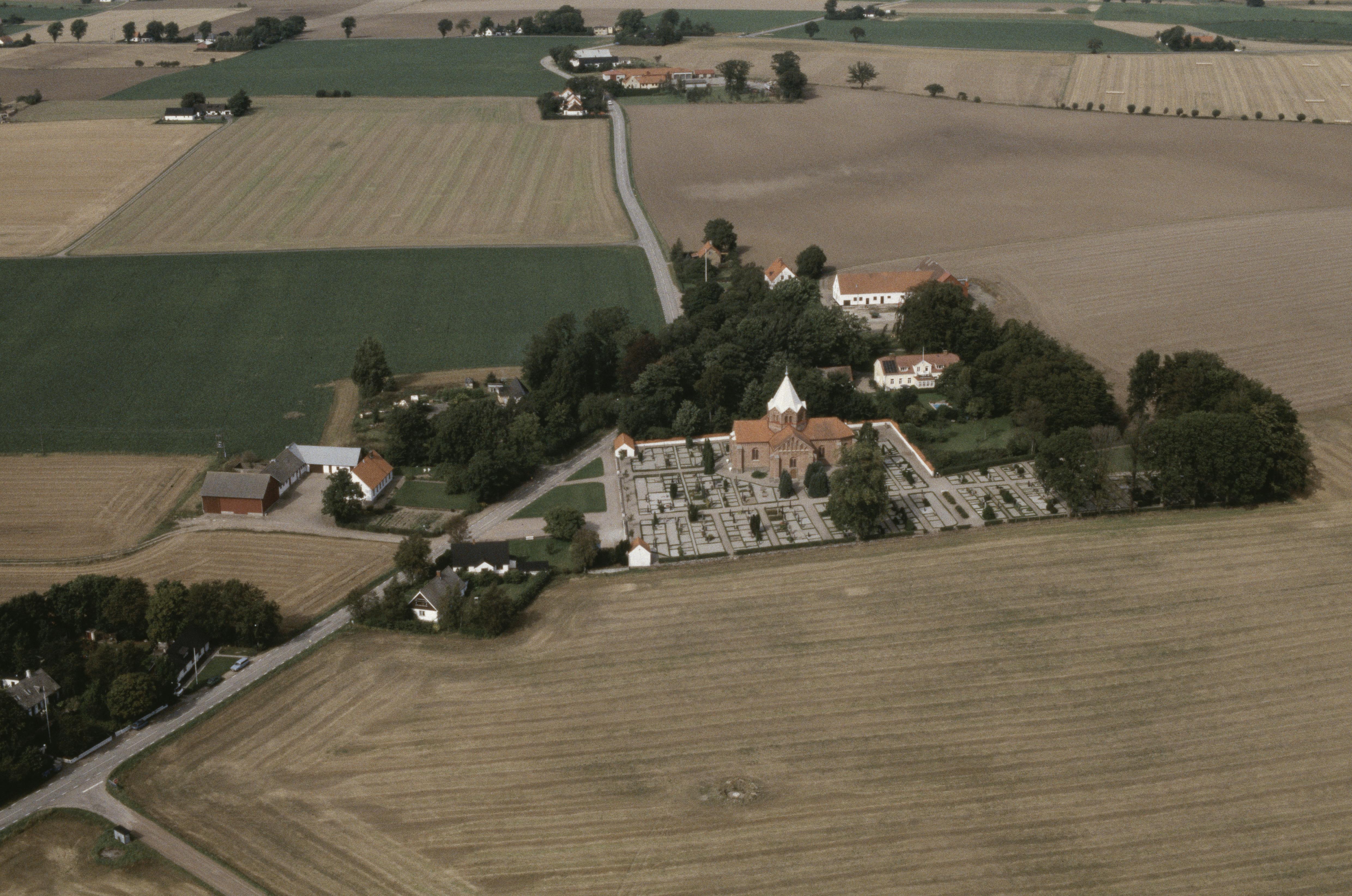 Beskrivning: Tullstorps kyrka och kyrkby. Bilden är tagen mot (väderstreck): NNO