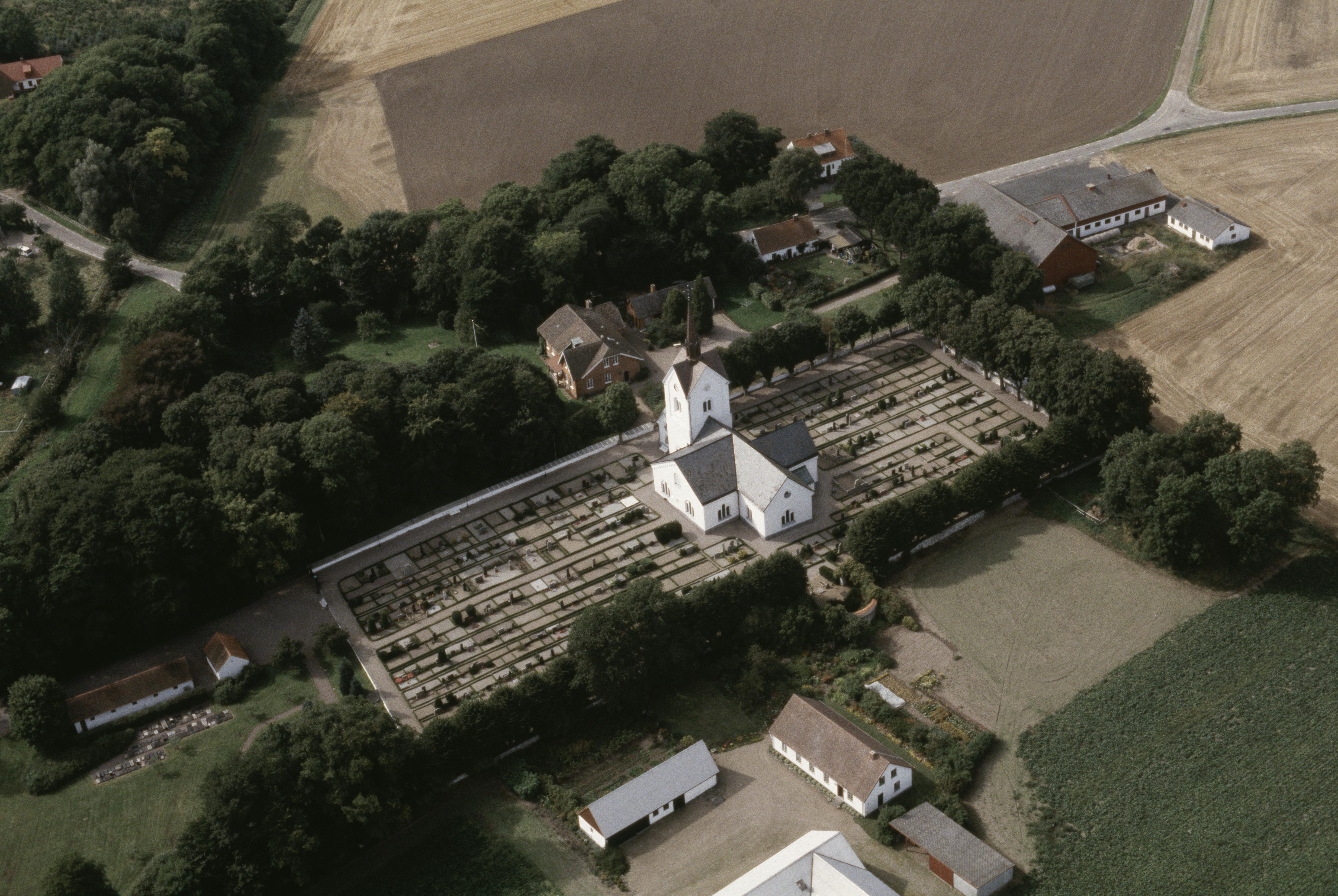 Beskrivning: Östra Vemmenhögs kyrka. Till höger om bildens mitt högen Väpmannahög RAÄnr Östra Vemmenhög 2:1. Bilden är tagen mot (väderstreck): VNV